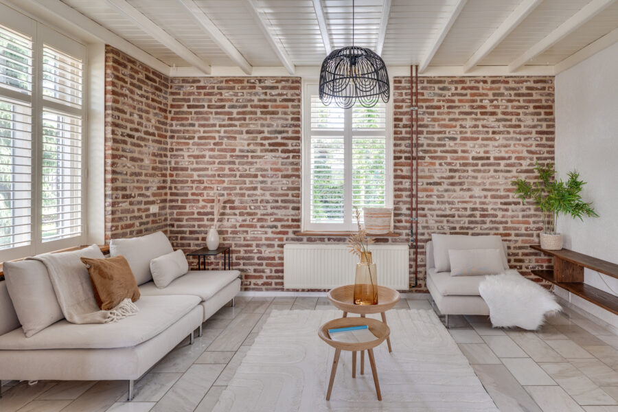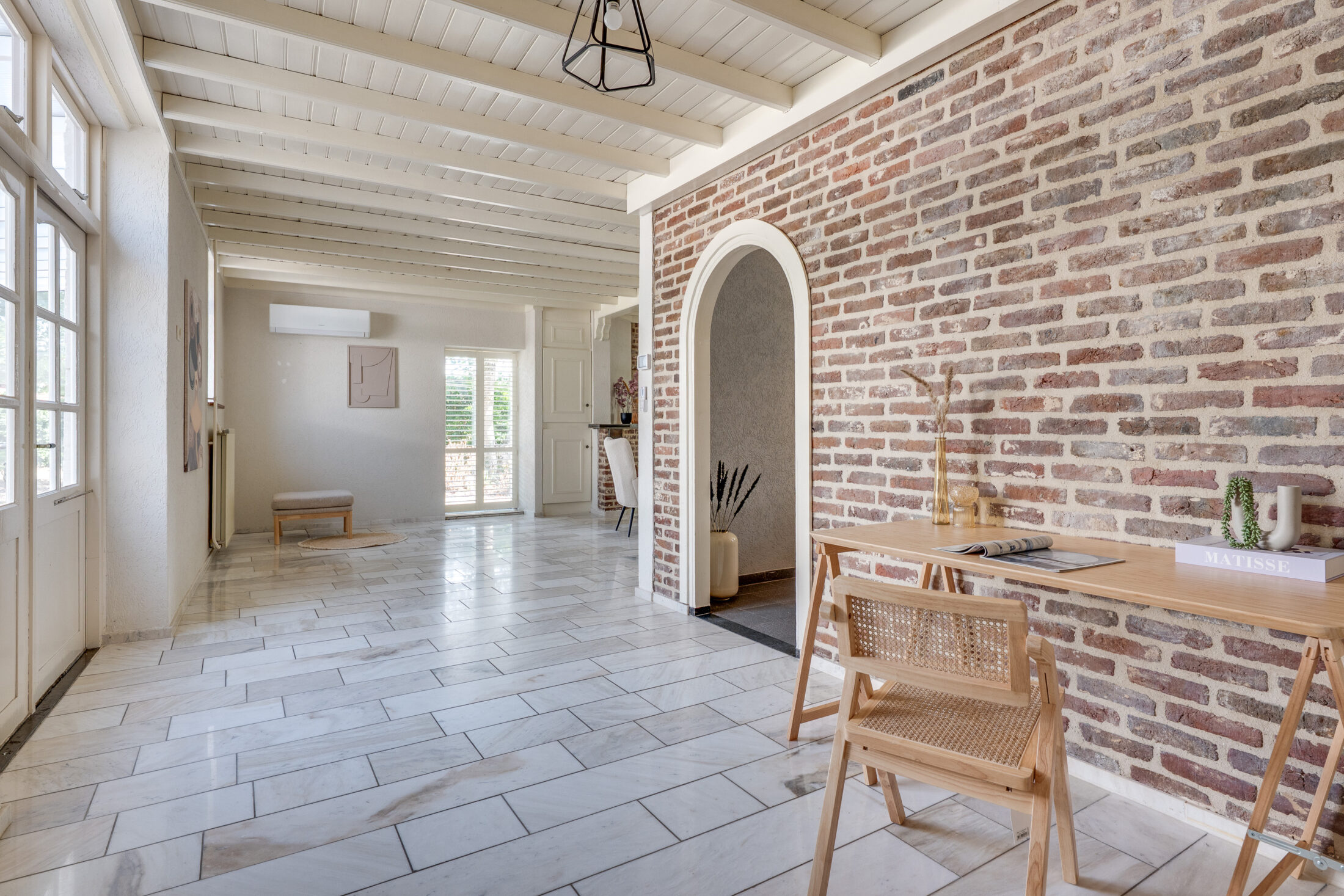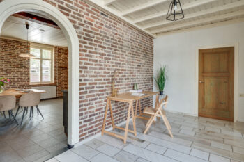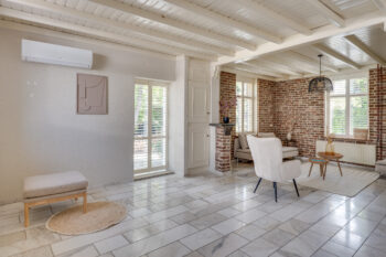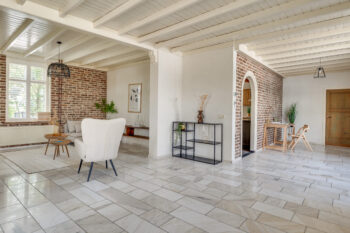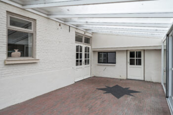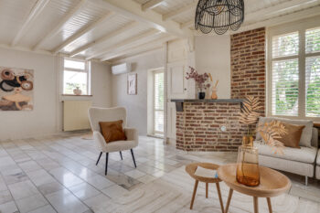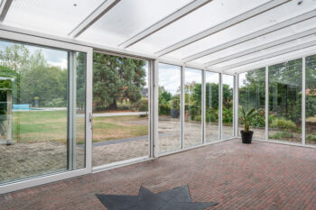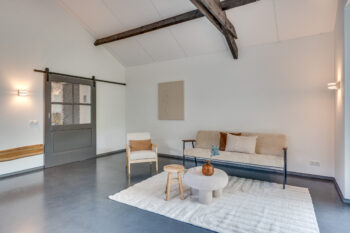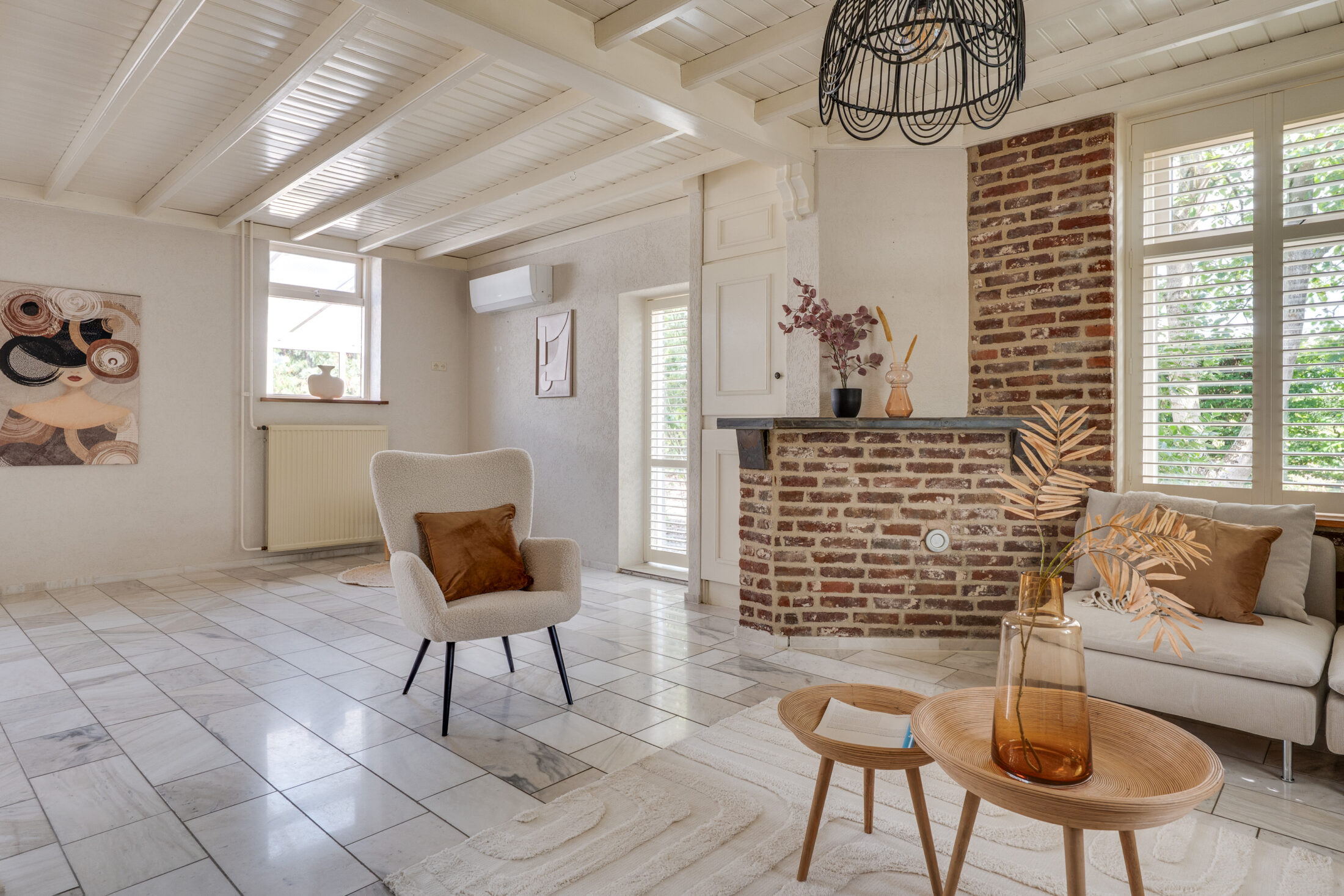 De L-vormige woonkamer is ruim te noemen. De ramen rondom zorgen voor lichtinval. Het balkenplafond i.c.m. de schoonmetselwerk wanden zorgen voor sfeer. De airco zorgt voor een prettig binnenklimaat. De woonkamer is voorzien van een portaal waar een toiletruimte is gevestigd. Een dubbele openslaande deur geeft toegang tot de serre.