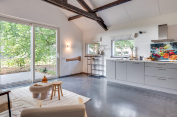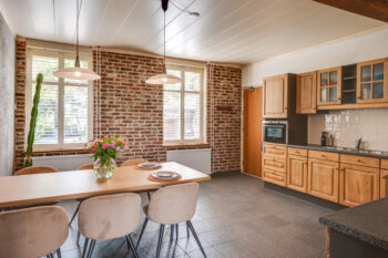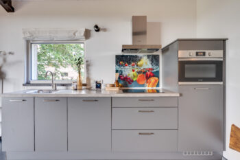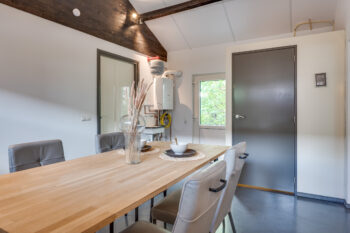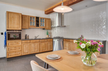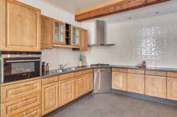 De dichte leefkeuken heeft een oppervlakte van circa 22 m² en biedt volop ruimte voor een grote eettafel. De keuken is uitgerust met diverse inbouwapparatuur, waaronder een vaatwasser, een gaskookplaat met afzuigkap en een combi-oven/magnetron.