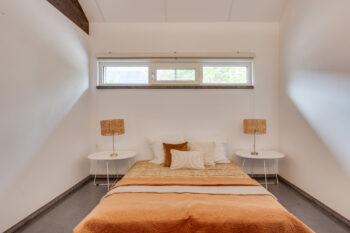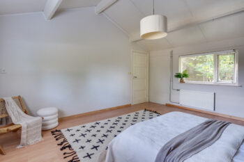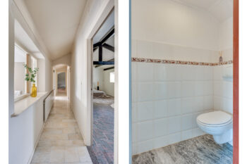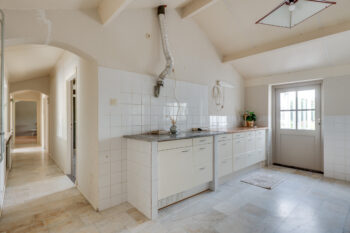 Vanuit de woonkamer lopen we door naar de bijkeuken/hal. Deze ruimte biedt toegang tot de badkamer, toiletruimte en de vier slaapkamers. De bijkeuken is voorzien van een eigen keukenblok met (extra) koelkast. Daarnaast is er een handige inbouwkast aanwezig.