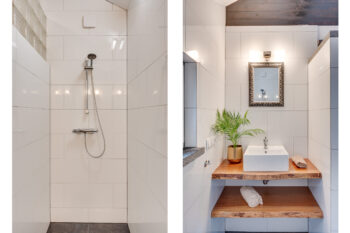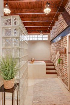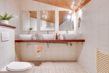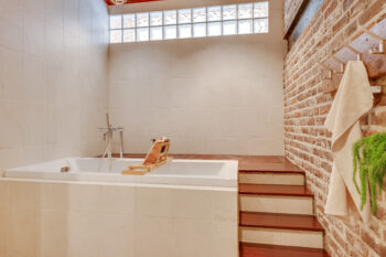 De uitermate ruime badkamer heeft een niet alledaagse inrichting. Zo beschikt u over maar liefst 3 aparte wastafels, een toilet, een inloopdouche en een ligbad welke via een trapje te bereiken is.