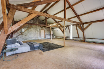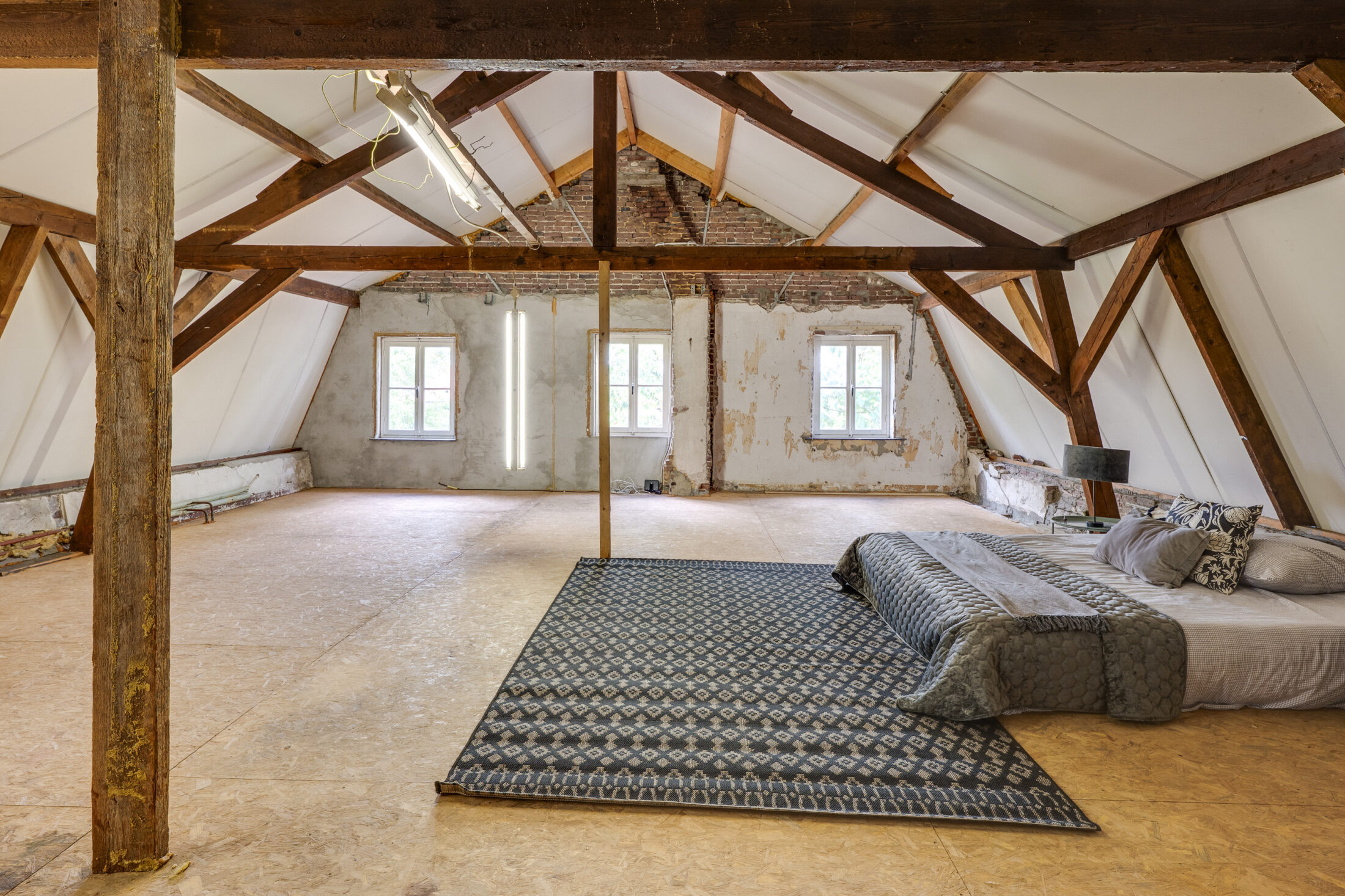 Vanuit de hal is er een vaste trap naar de voorzolder welke toegang geeft tot de open zolderruimte van maar liefst 79 m² groot. Zoals u kunt zien is de kap geïsoleerd en kijkt u mooi tegen de houten balken. Hier kunt u iets moois creëren!