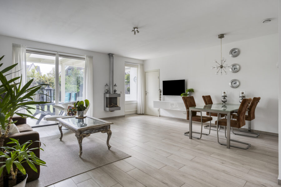 sfeervolle gashaard maakt deze ruimte perfect voor ontspannen avonden. De woonkamer staat in open verbinding met de moderne leefkeuken aan de voorzijde.