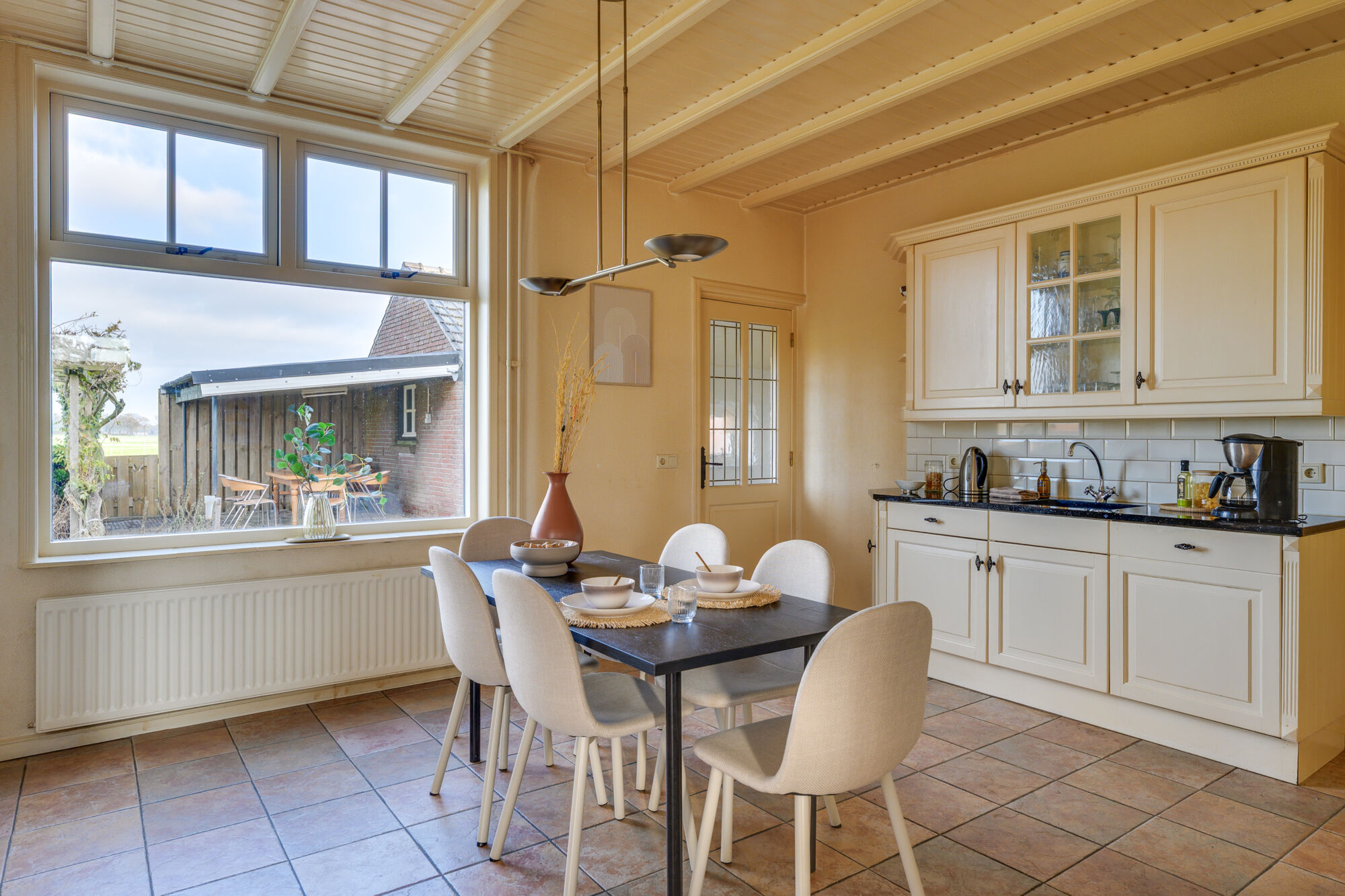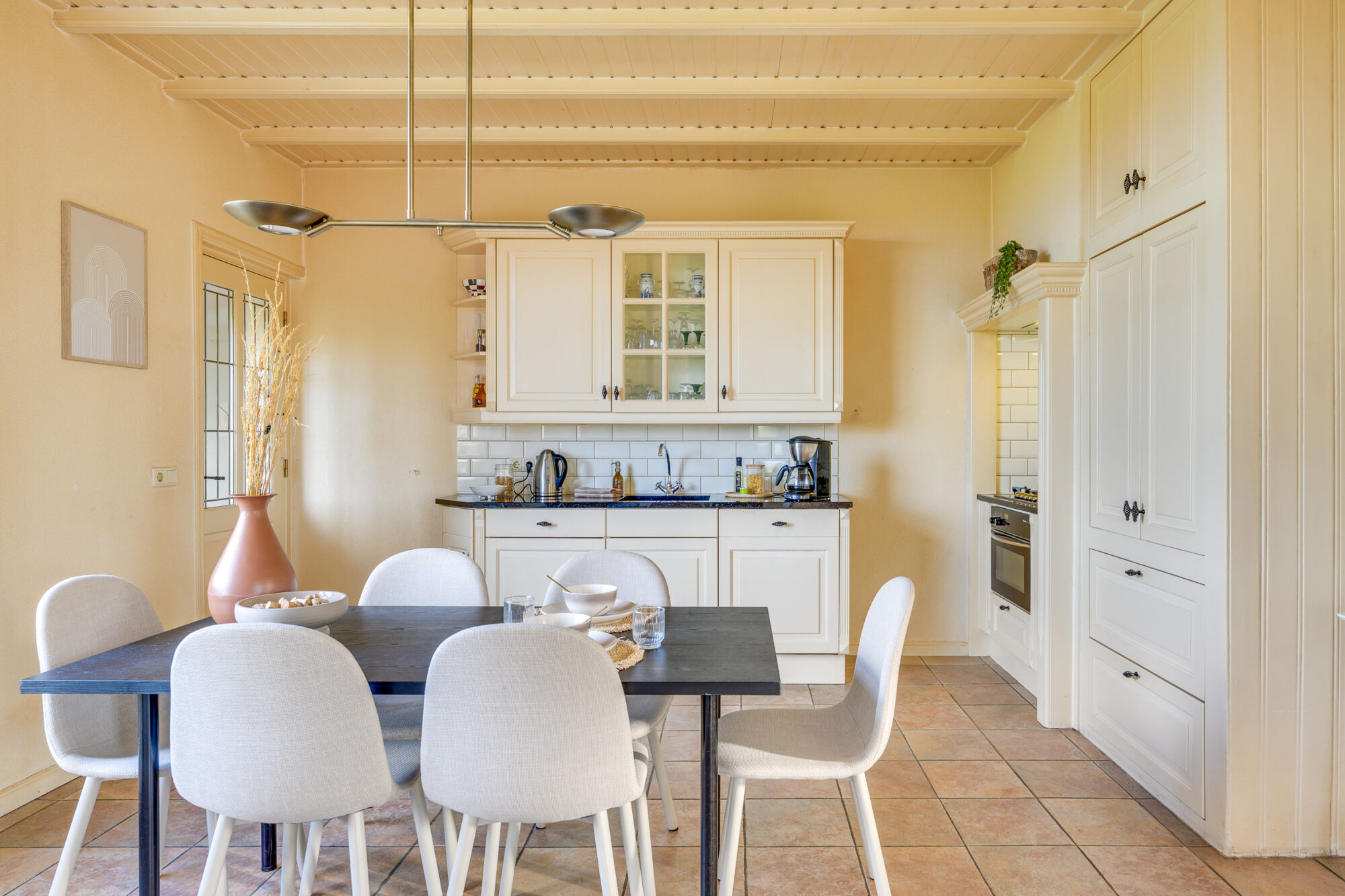 Via glas-in-looddeur gaat u naar de gezellige, ruime woonkeuken waar u goed een tafel kunt plaatsen. De bij de stijl van de woonboerderij passende keukeninrichting is in het jaar 2000 geplaatst en v.v. gaskookplaat, afzuigschouw en oven. Vanuit het grote raam heeft u fijn contact met de achtertuin en fraai weids uitzicht. Achter in deze keuken de fijne kelder met een hoogte van ca. 1,77 meter.