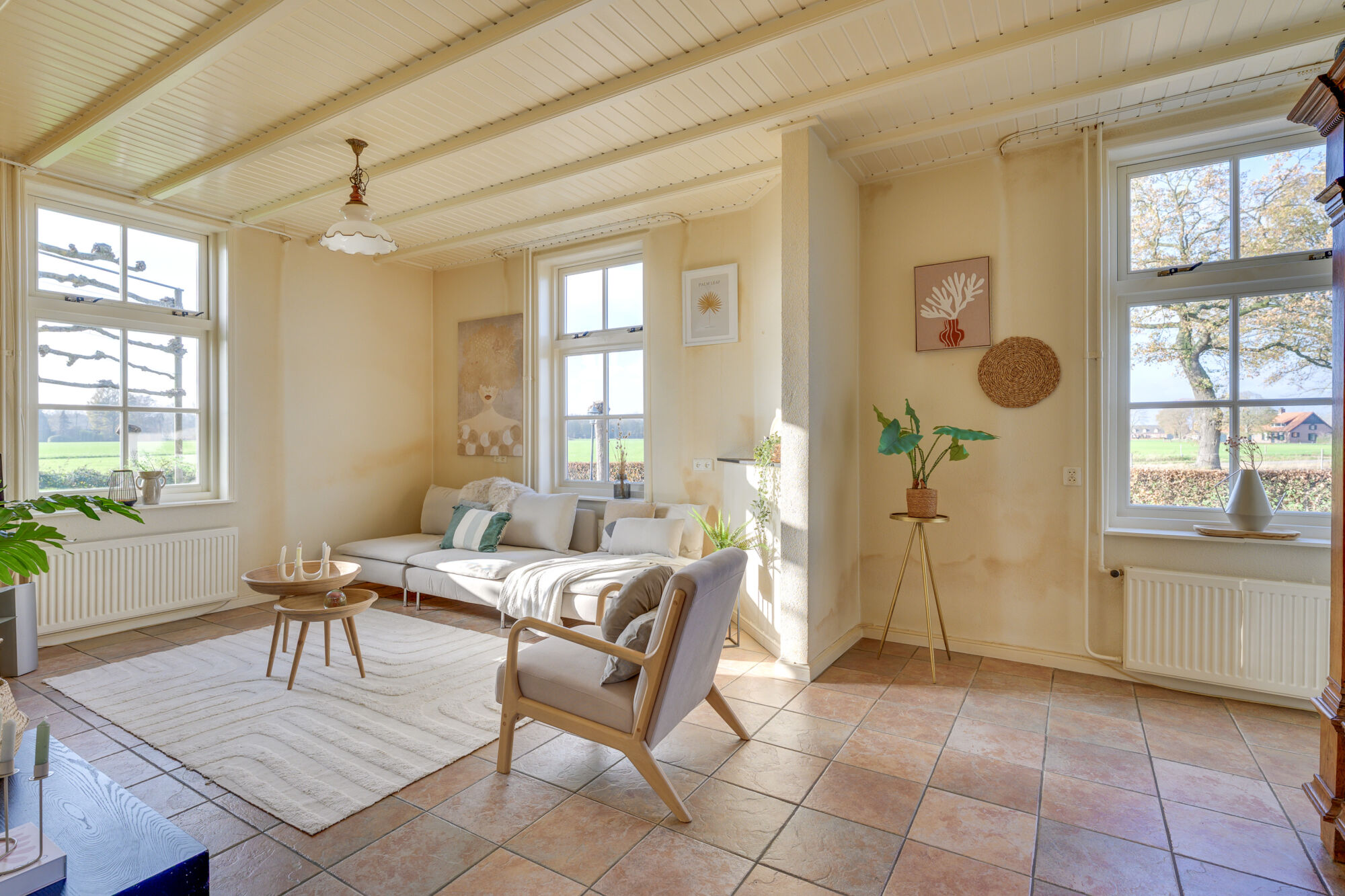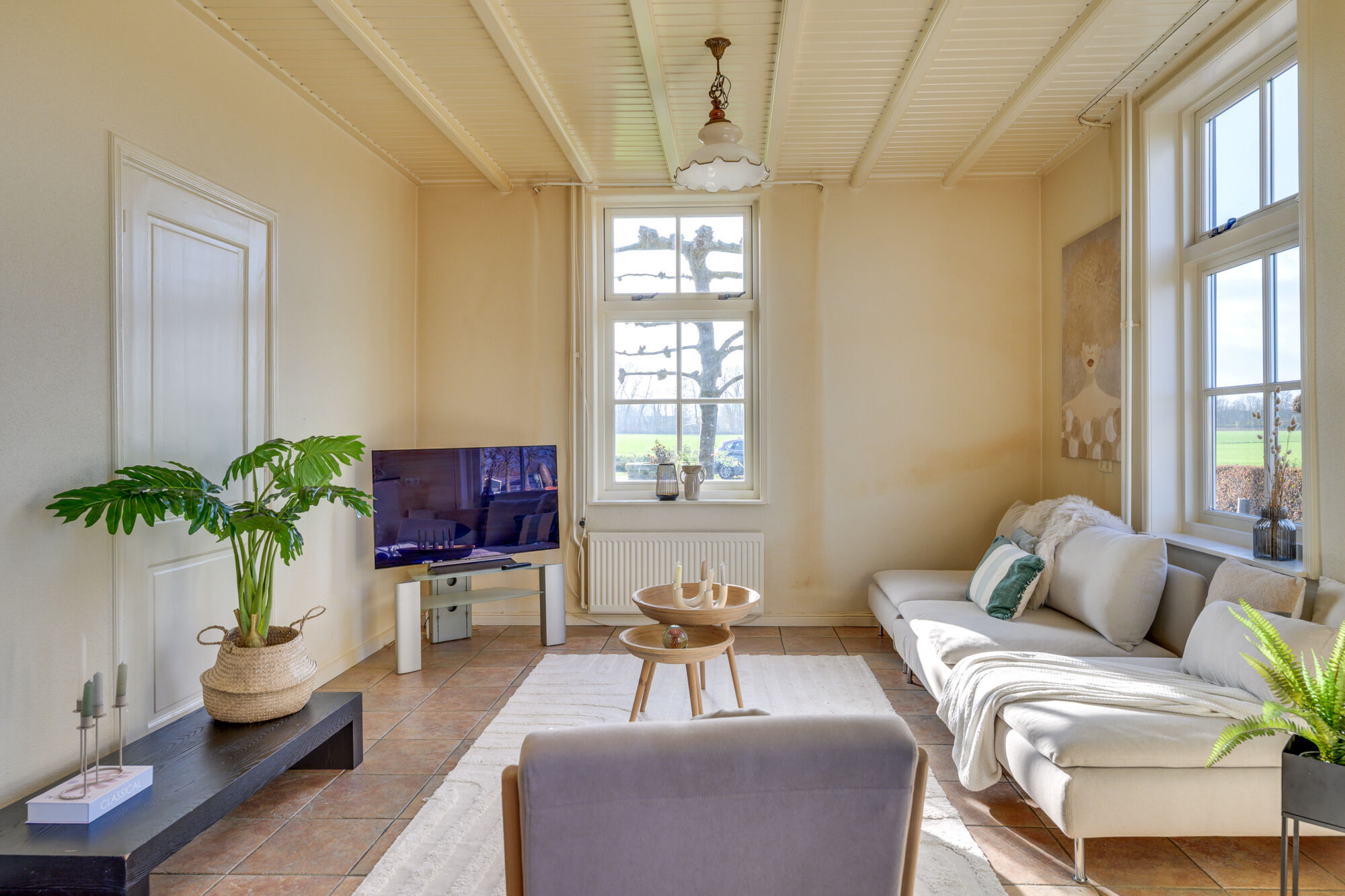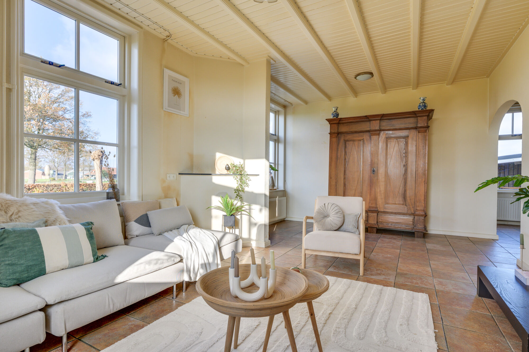Via grote boog is er een open verbinding naar de living. Ook hier weer dezelfde tegelvloer als in keuken en benedenslaapkamer en geheel vloerverwarmd. De sfeervolle living geniet ook van veel lichtinval door de drie grote raampartijen. Hierdoor kijkt u weids weg aan beide kanten.