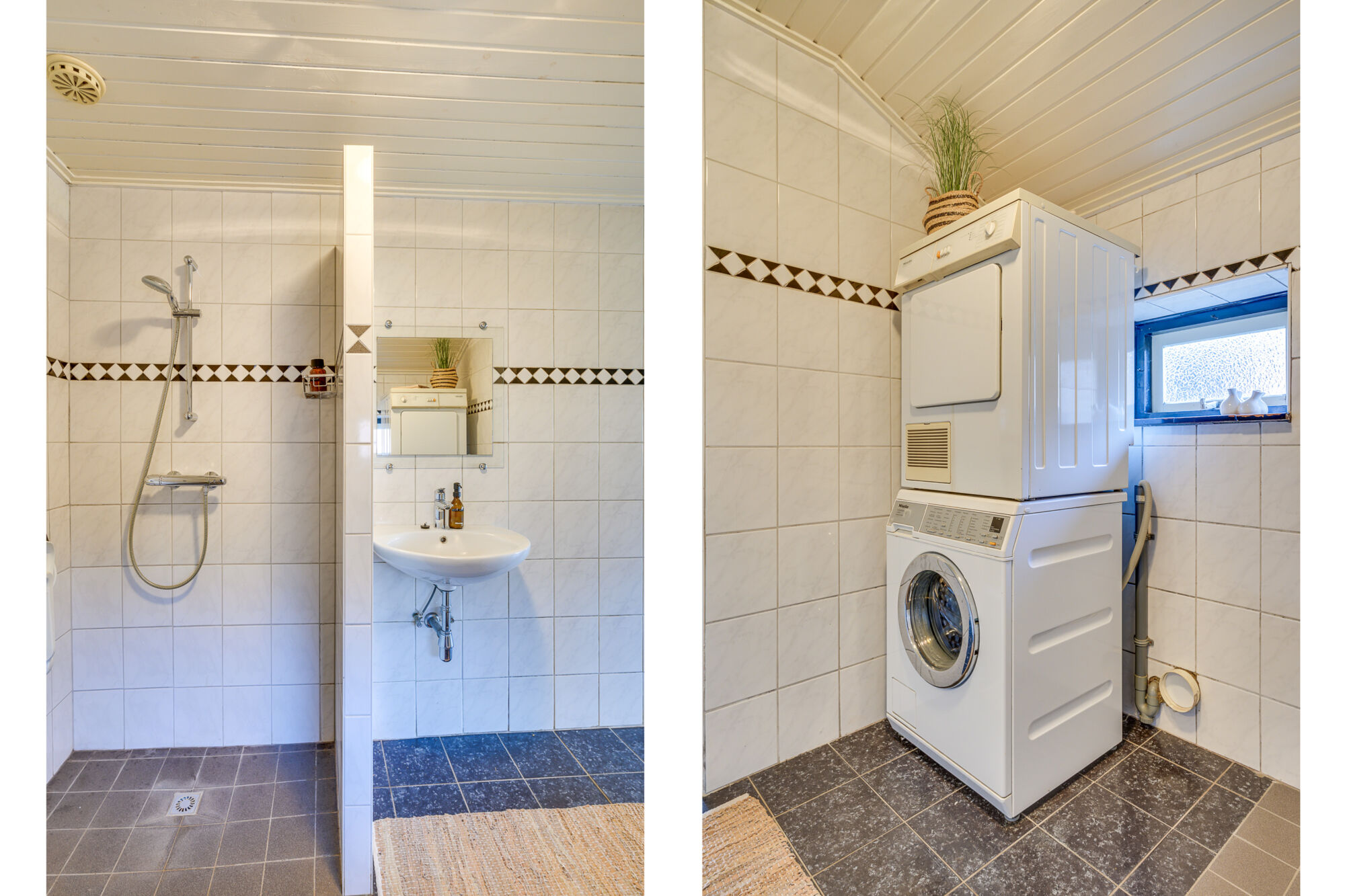 De netjes afgewerkte badkamer is voorzien van een inloopdouche, vaste wastafel en beschikt tevens over de
