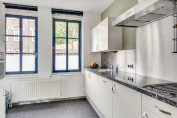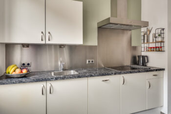 De royale keuken, gesitueerd aan de voorzijde van de woning, is uitgevoerd in een lichte kleurstelling en biedt veel bergruimte. De vaatwasser, inductie kookplaat en RVS afzuigkap (met RVS wandplaat) worden gecompleteerd met een Amerikaanse koelkast en combi-magnetron welke in een aparte keukenkast is geïntegreerd.