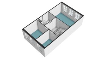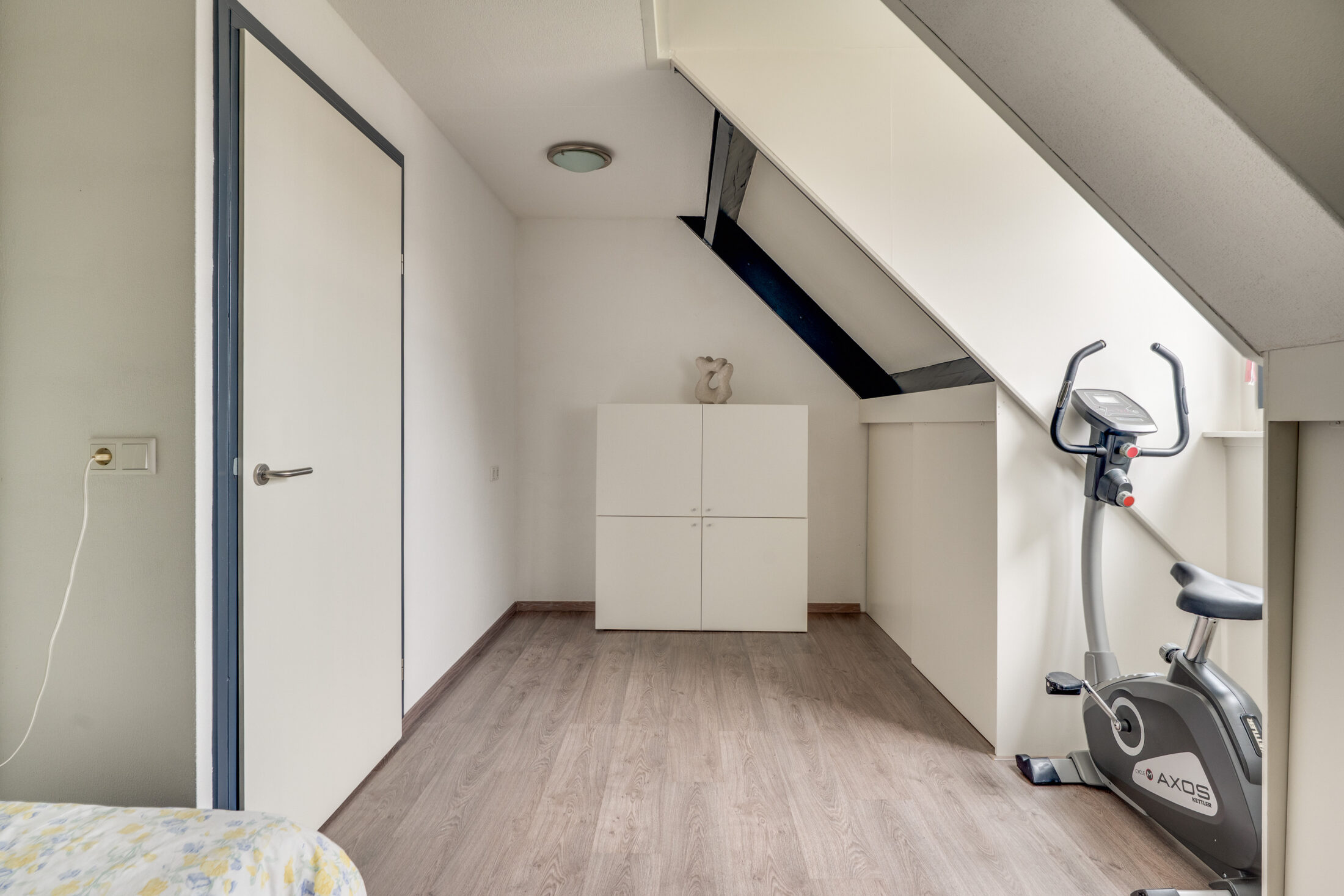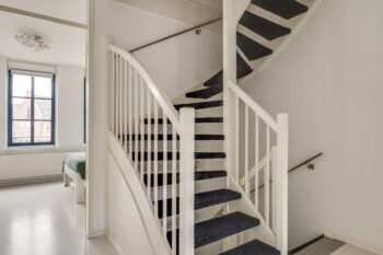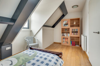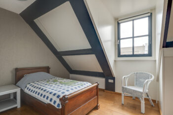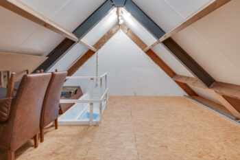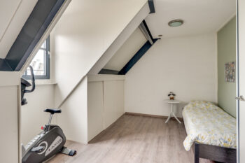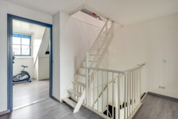 Via een vaste trap is de extra aangebrachte derde verdieping bereikbaar. Deze is gerealiseerd in de extra hoge nok van de woning en biedt verrassend veel bergruimte.