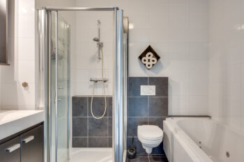 De ruime badkamer is optimaal ingedeeld en volledig uitgerust met een douche, voorzien van een cabine, een vaste wastafel met meubel, een tweede toilet en een whirlpool ligbad. Een fraaie roestvrij stalen design radiator maakt het geheel af.