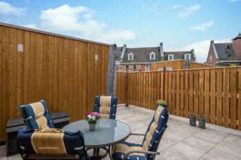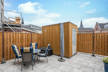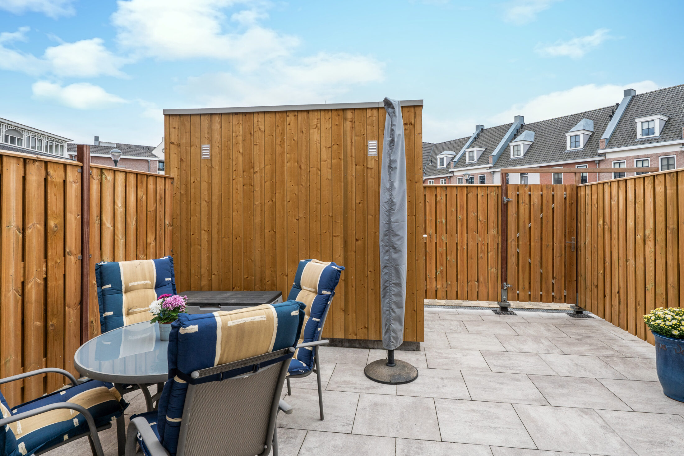 De zonnige achtertuin is onderhoudsvrij aangelegd en voorzien van een mooie neutrale lichtgrijze tegel. De houten berging biedt plek voor de fietsen. Parkeren doet u op de eigen parkeerplaats in de kelder.