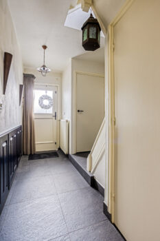 De berging biedt u tevens de mogelijkheid om een extra koelkast of vriezer te plaatsen. De toiletruimte, welke voorzien is van een wandcloset, een fonteintje en stijlvol tegelwerk, is eveneens aan de achterzijde van de woning gevestigd. De hal is voorzien van een garderobeopstelling en verbindt de woonkamer met de achtertuin via een tuindeur.