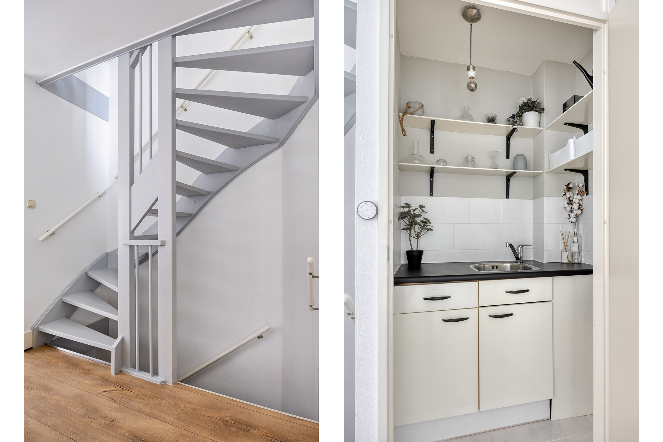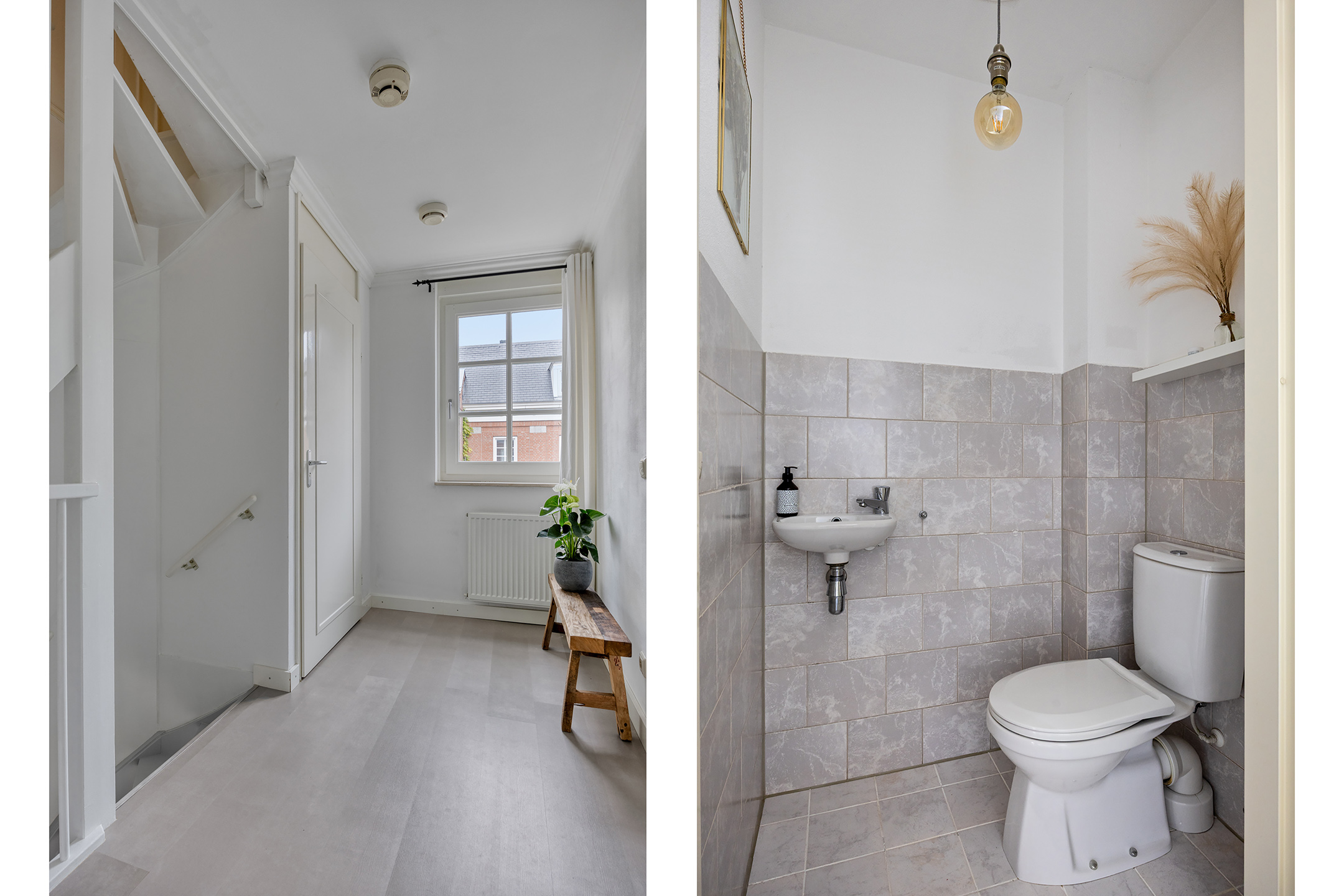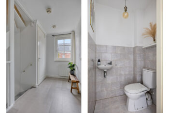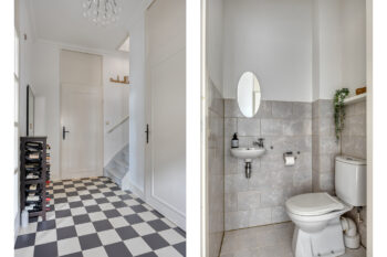 De entree van deze woning biedt toegang tot de dichte keuken, de toiletruimte, de trapopgang en de bijkeuken. Onder de trap bevindt zich een bergingsruimte. Deze voorziet de mogelijkheid uw provisie te bergen. De woning is zowel aan de buiten als binnenzijde voorzien van fraaie details, zoals sierlijsten en rozetten, die bijdragen aan de karakteristieke uitstraling. De toiletruimte is voorzien van strak tegel- en stucwerk, daarbij is deze ruimte voorzien van een staand toilet en een fonteintje.