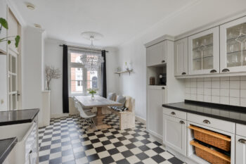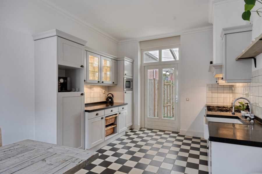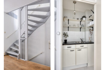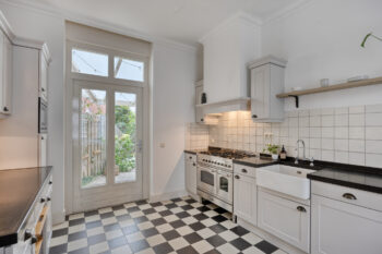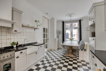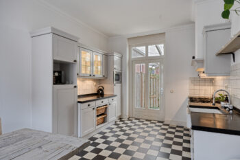 Op de begane grond met uitzicht over de sfeervolle woonstraat bevindt zich deze woonkeuken. Over de gehele diepte van de woning beschikt deze keuken over de ruimte een gezellige dinertafel te plaatsen. Aan de achterzijde van deze ruimte bevindt zich de keukenopstelling tegen overstaande wanden.