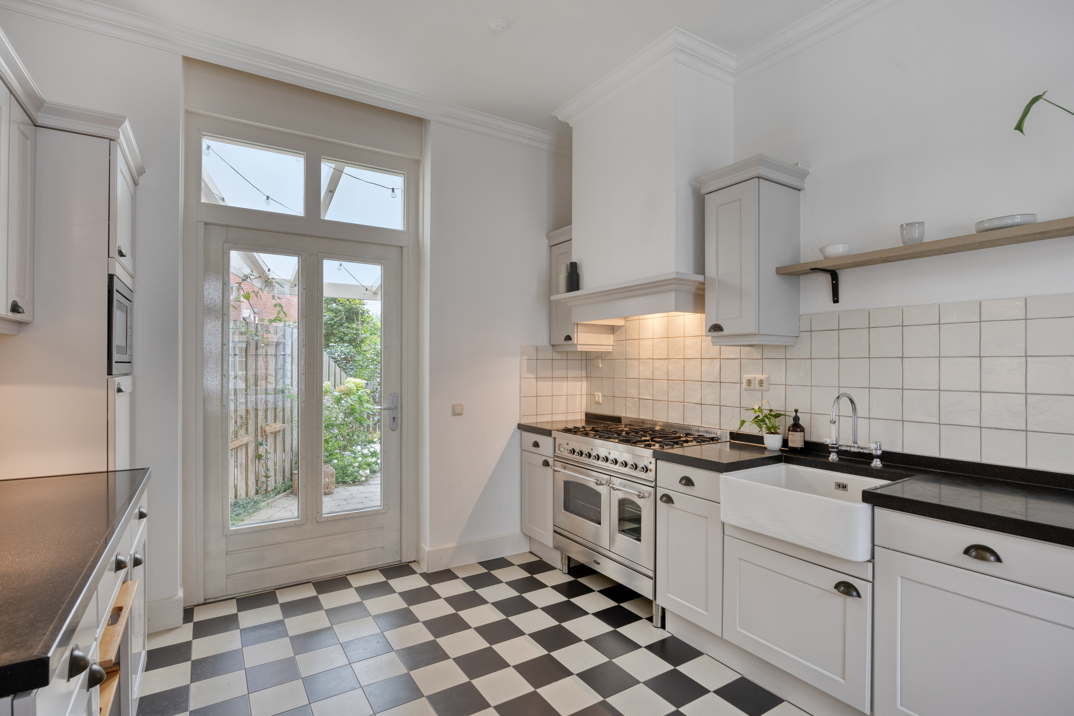 Dankzij de hoge plafonds heeft de ruimte een heerlijk open en ruimtelijk gevoel. De moderne vloerverwarming zorgt voor extra behaaglijkheid, terwijl het stijlvolle Boretti-gasfornuis met twee ovens perfect is voor de liefhebber van koken en gezellig tafelen. Aan de achterzijde van deze ruimte bevindt zich de keukenopstelling, geplaatst tegen overstaande wanden. De aanwezige kast- en werkruimte, in combinatie met de inbouwapparatuur, vormen samen een ideale woonkeuken. Aan inbouwapparatuur treffen we onder andere: