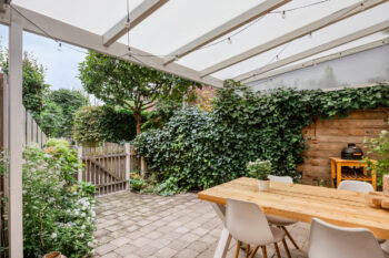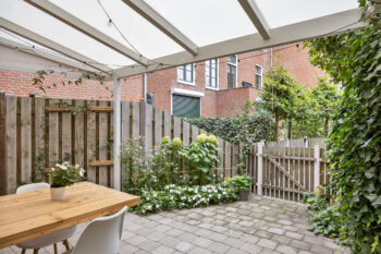 De keuken verzorgt toegang tot het ruime overdekt terras in de tuin welke onderhoudsvriendelijk uitgevoerd is. Het straatwerk vloeit over in het pad richting het parkeerterrein. De aanwezigheid van het overdekt terras en een zuidelijke ligging verzorgt de mogelijkheid om al vroeg in het jaar te genieten van het buitenleven! Het plaatsen van een gezellige dinertafel of een loungeset behoort zeker tot de mogelijkheden!