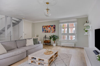 Via de vaste trap bereiken we de eerste verdieping van deze fijne woning. Op de eerste verdieping bevindt zich de ruime en sfeervolle woonkamer. Dankzij de nette afwerking, de grote ramen en het fraaie uitzicht over de gezellige woonstraat is dit een heerlijke plek om te verblijven. De woonkamer beschikt tevens over een keukenblok met spoelbak, ideaal voor het eventueel plaatsen van een extra koelkast. De trapopgang verzorgt toegang tot de tweede verdieping.