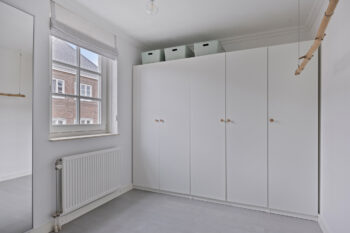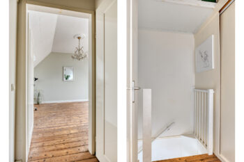 De overloop van deze tweede verdieping biedt toegang tot de separate toiletruimte, badkamer en twee slaapkamers. Via de vaste trap bereikt u de derde verdieping.