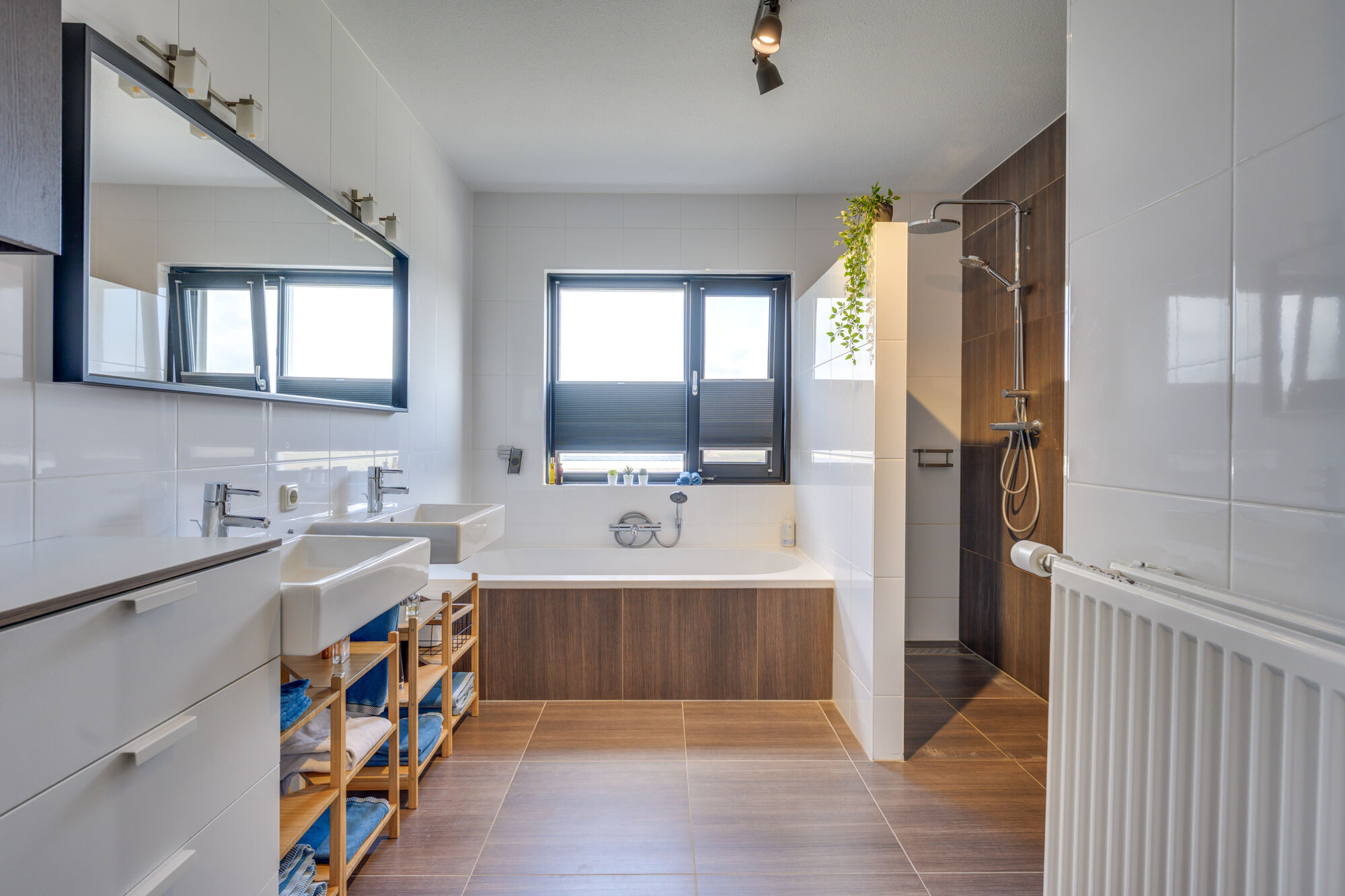 De badkamer is een zeer ruime en comfortabele ruimte, voorzien van een inloopdouche met zowel een regendouche als een handdouche. Daarnaast beschikt de badkamer over een tweede toilet, een ligbad en een dubbele wastafel.