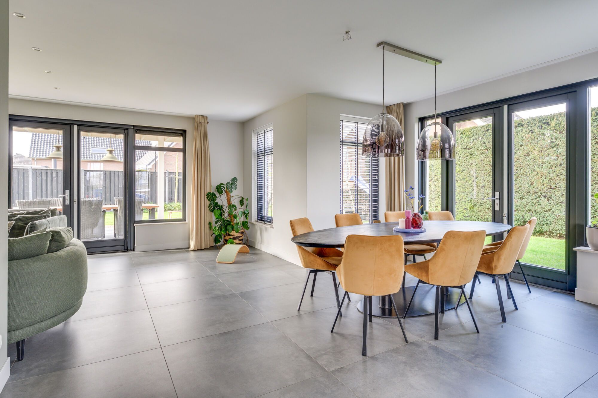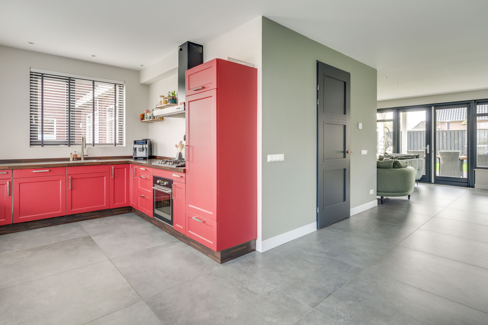 De woonkamer is aan de achterzijde gelegen. Hierdoor heeft u veel privacy wanneer u tv kijkt. De woonkamer heeft zicht op de achtertuin en ook deze in middels openslaande deuren te bereiken. Wat opvalt aan de gehele begane grond is dat u ontzettend veel lichtinval heeft. Zowel de voor-, achter- en zijgevels zijn voorzijn van grote ramen.