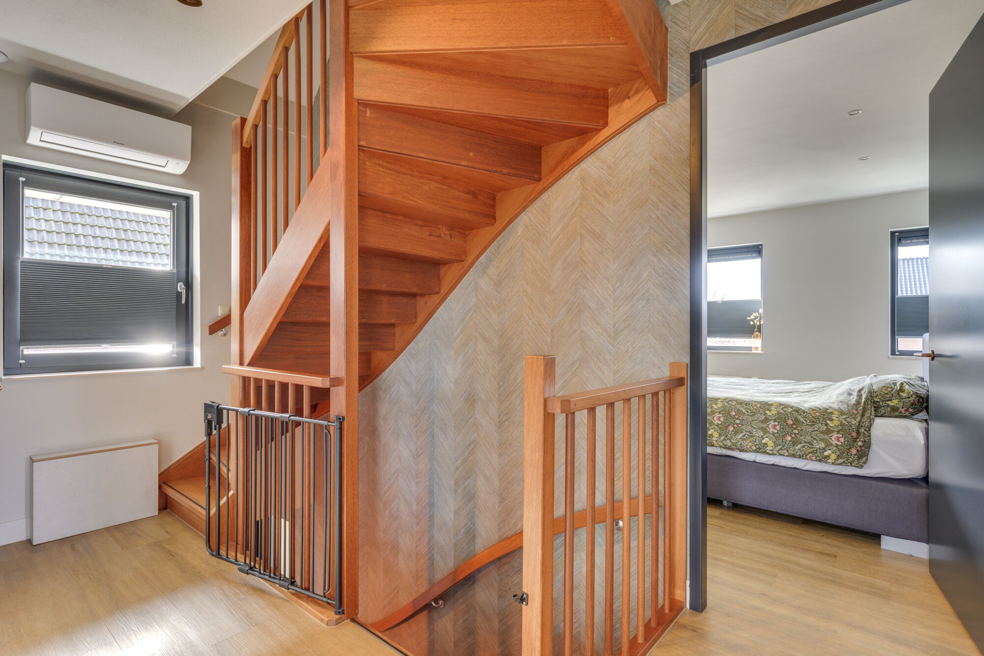Overloop met daaraan gelegen drie ruime slaapkamers, een badkamer en een cv-ruimte. Voor extra comfort is er een airco geplaatst op de eerste verdieping.