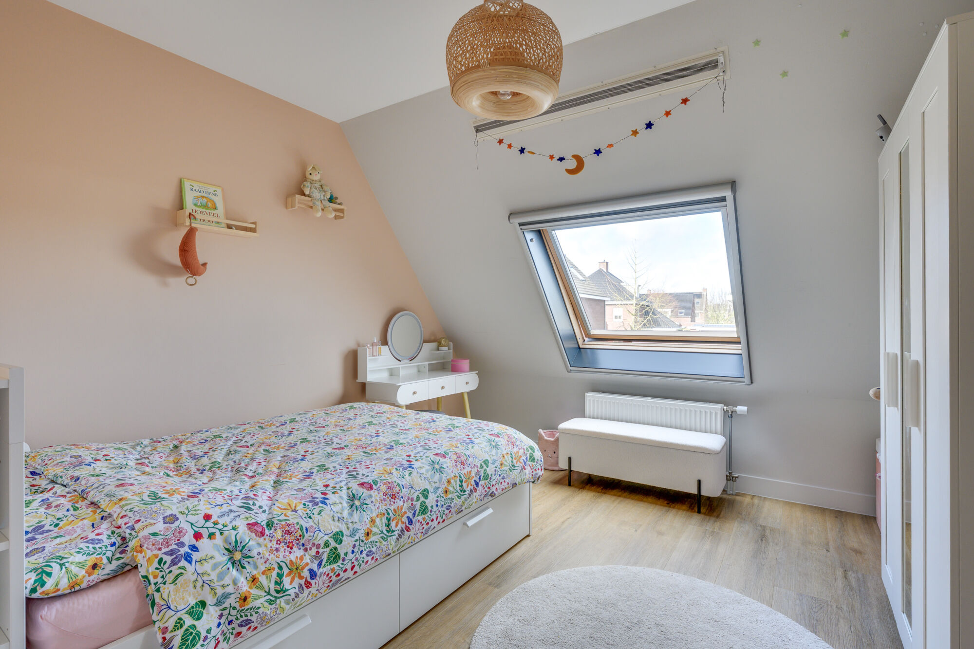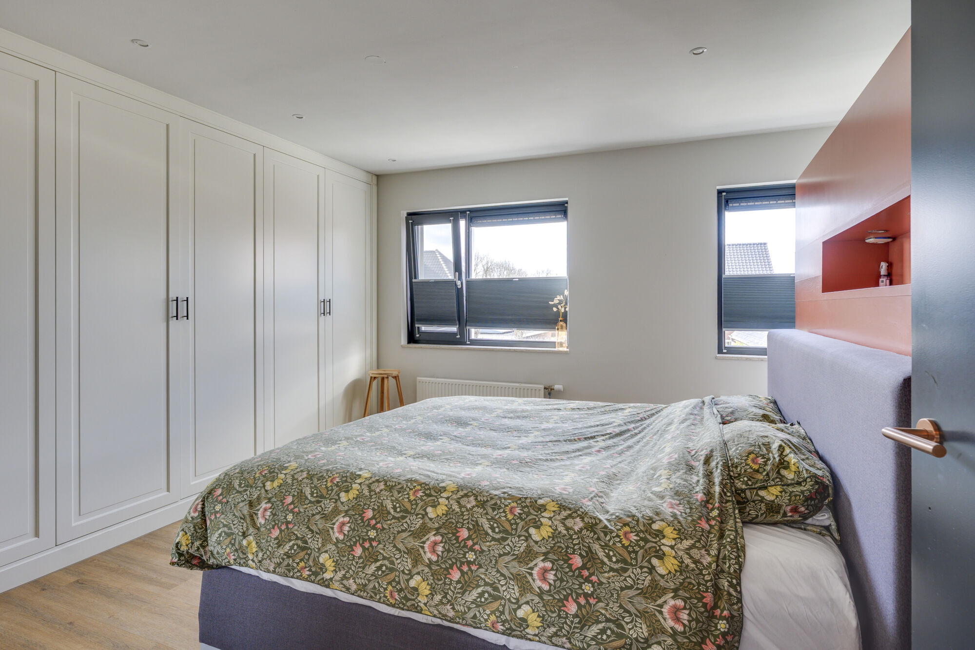 De ouderslaapkamer is voorzien van ingebouwde kasten. Daarnaast is er een roomdivider geplaatst, waarachter zich een
