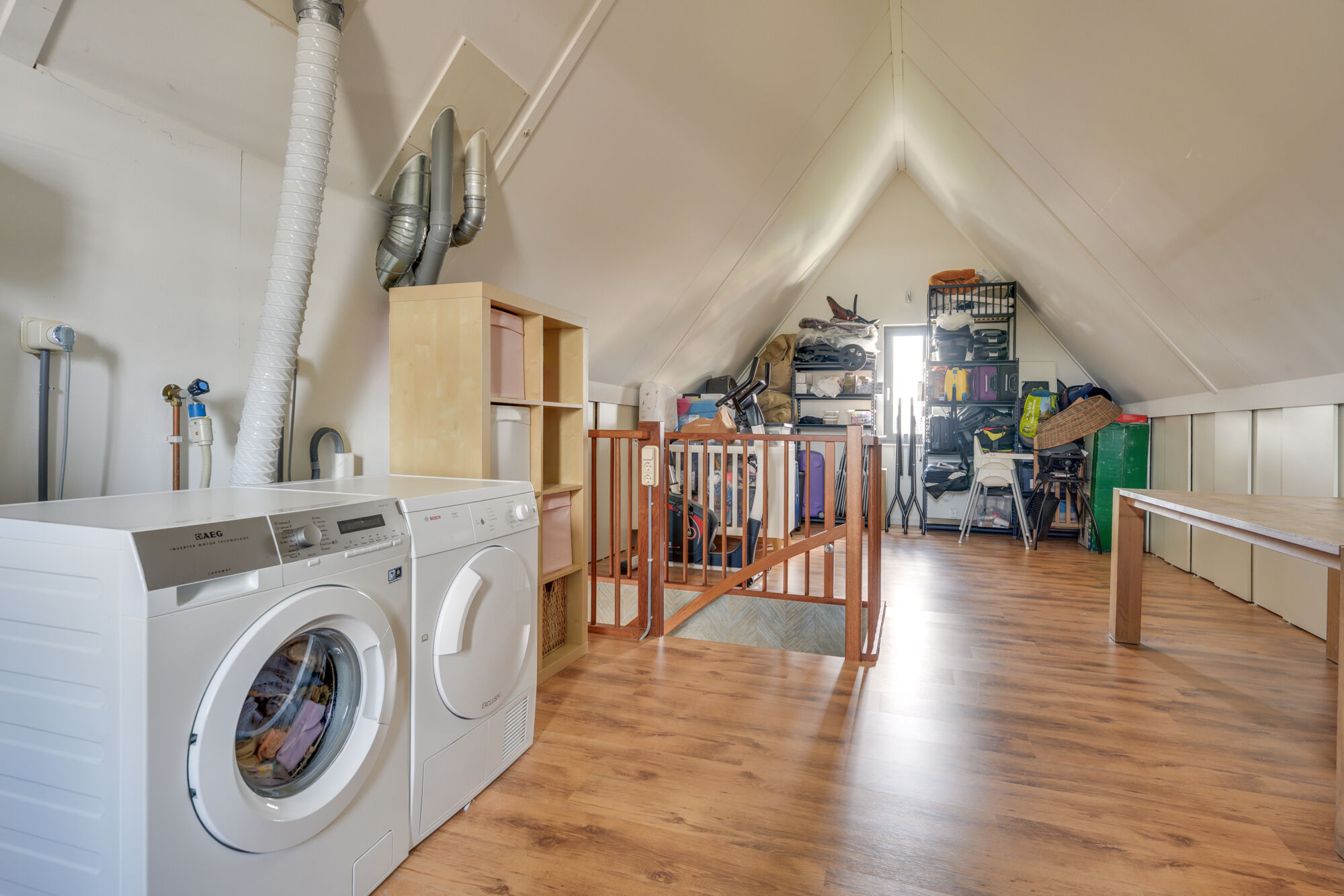 Via de vaste trap bereikt u de zolder. Zoals u kunt zien, is het realiseren van een extra slaapkamer hier eenvoudig mogelijk. Momenteel wordt de zolder gebruikt als was- en droogruimte.