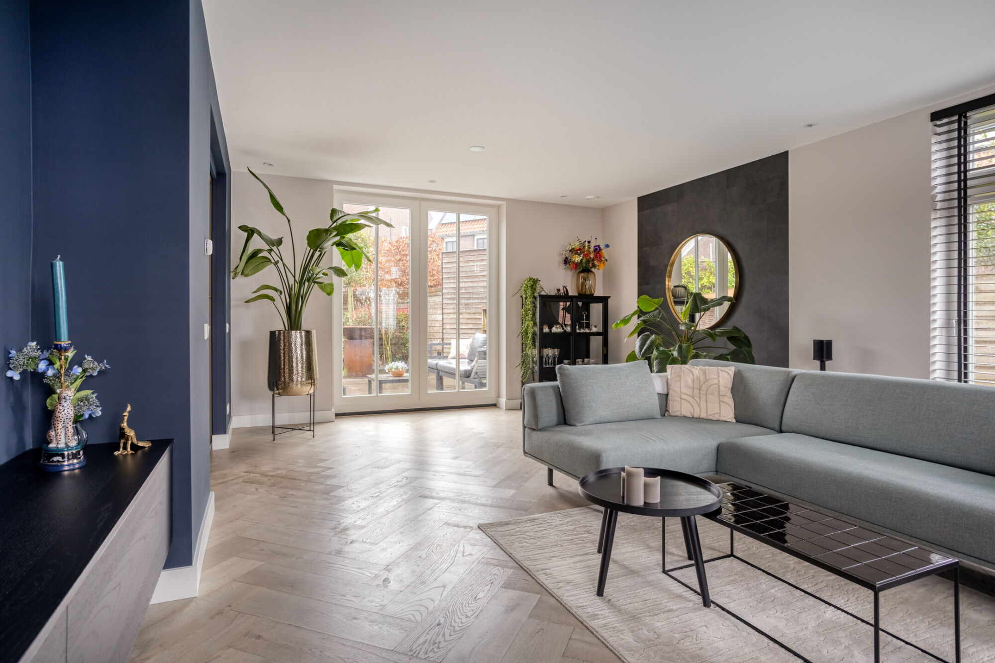 Vanuit de woonkeuken bereikt u via mooie stalen en-suite deuren de sfeervolle ruim bemeten living met eiken vloerdelen in Hongaarse visgraat. Dankzij de enorme hoeveelheid licht door de grote raampartijen ontstaat er een bijzonder ruimtelijk en open karakter. Het ingebouwde tv-meubel maakt het plaatje compleet.