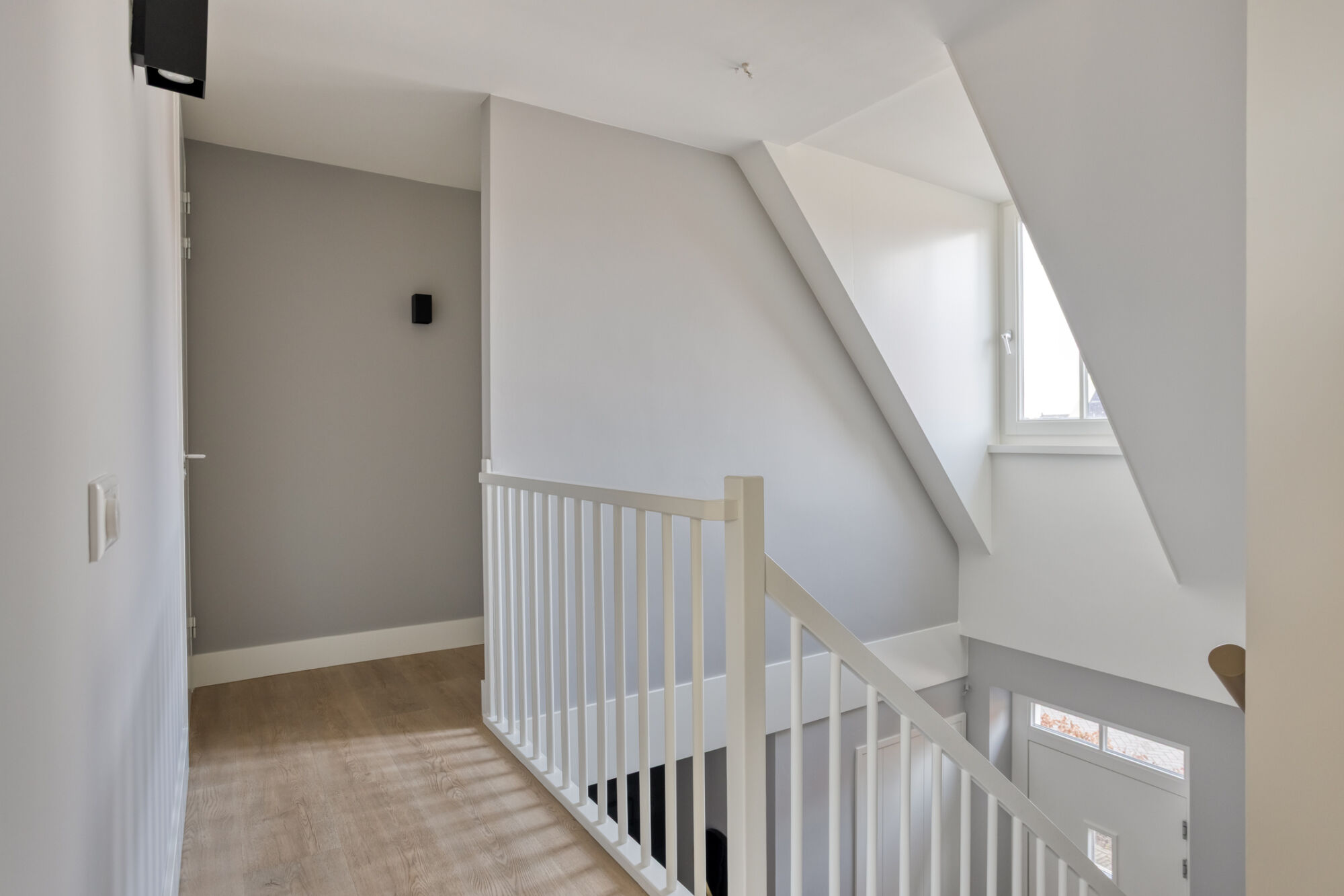 Ruime overloop met prachtige vide waaraan 4 slaapkamers en de luxe badkamer zijn gelegen. De gehele bovenverdieping is recent voorzien van een hoogwaardige PVC-vloer (2024) met hoge strakke witte plinten wat bijdraagt aan de moderne en verzorgde uitstraling. Daarnaast beschikt de woning over een zeer ruime bergzolder over de volledige breedte van het huis, bereikbaar via een vlizotrap.
