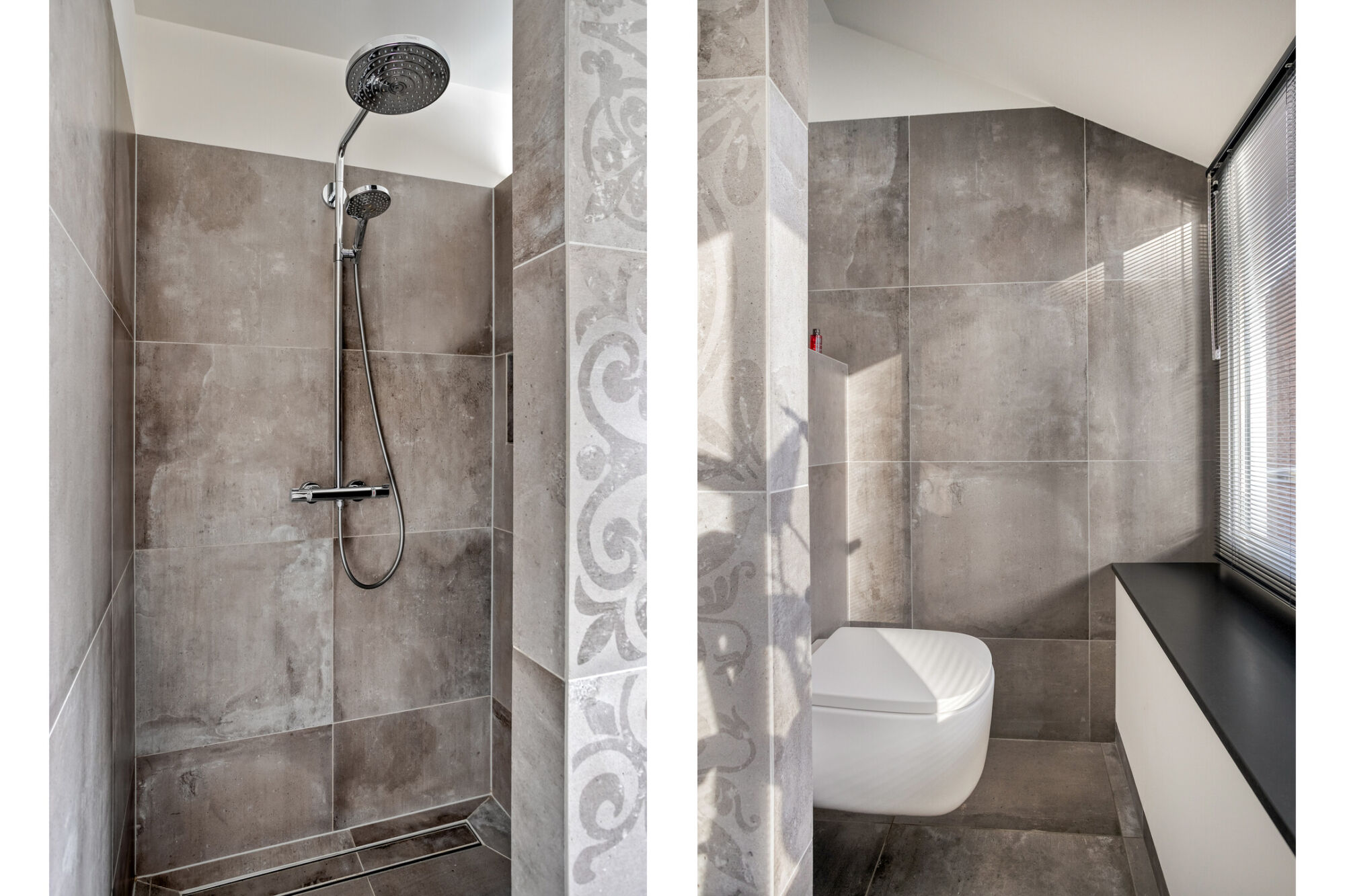 Een groot dakkapel zorgt voor extra daglicht en de mogelijkheid tot natuurlijke ventilatie. De badkamer heeft een luxe en comfortabele uitstraling.