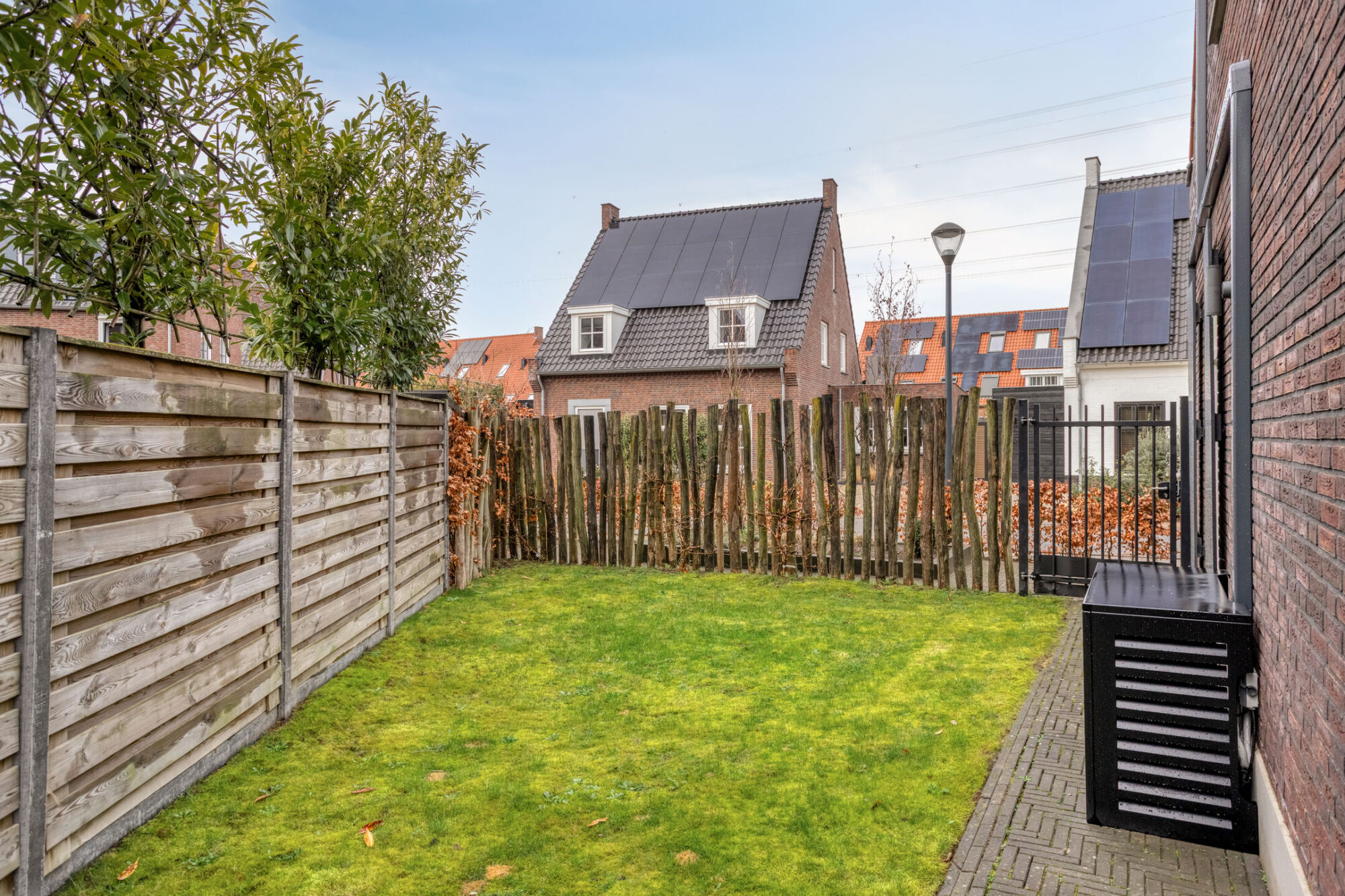 – Brede oprit met plaats voor drie auto’s naast elkaar, voorzien van een elektrische laadpaal;