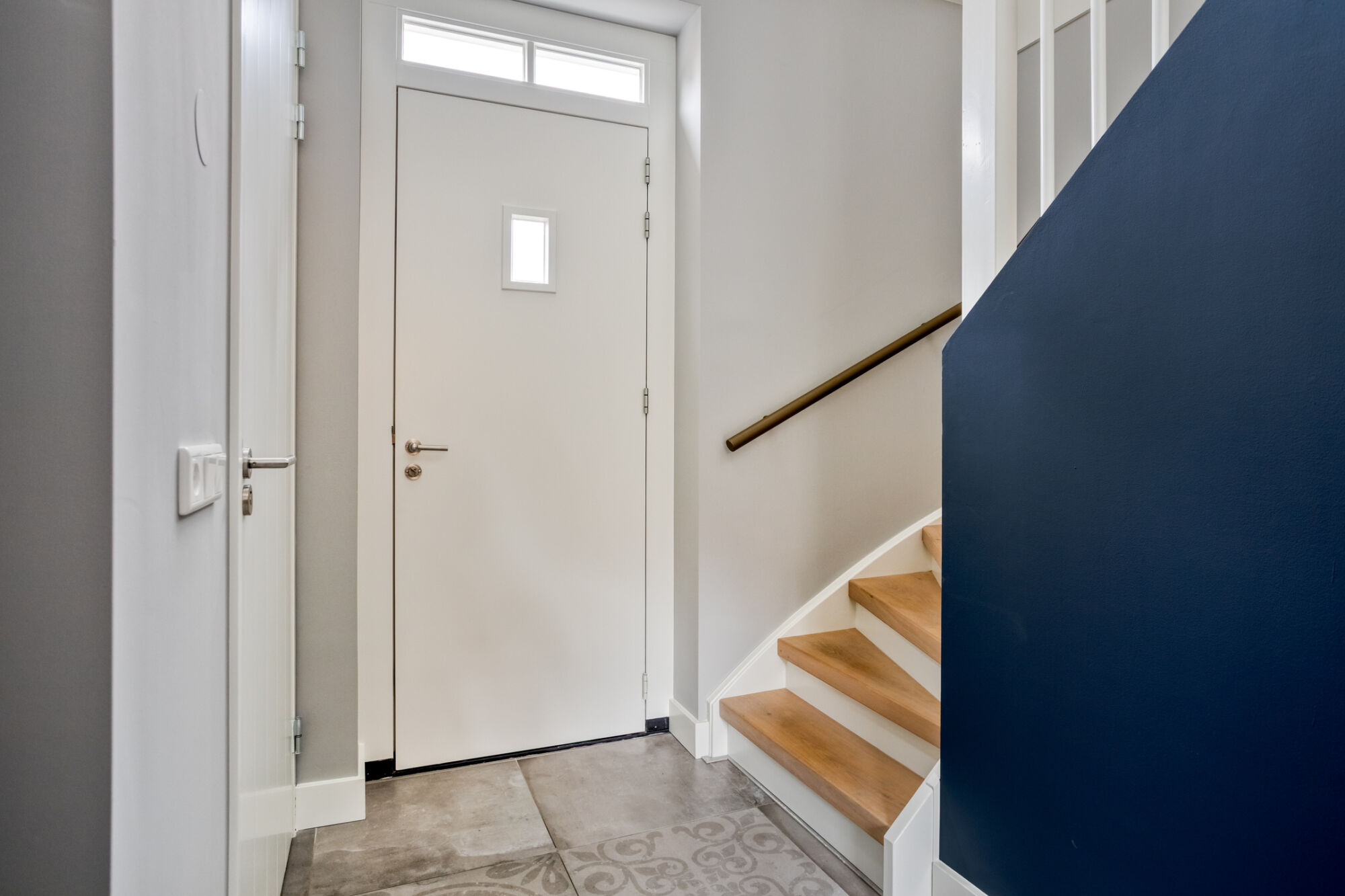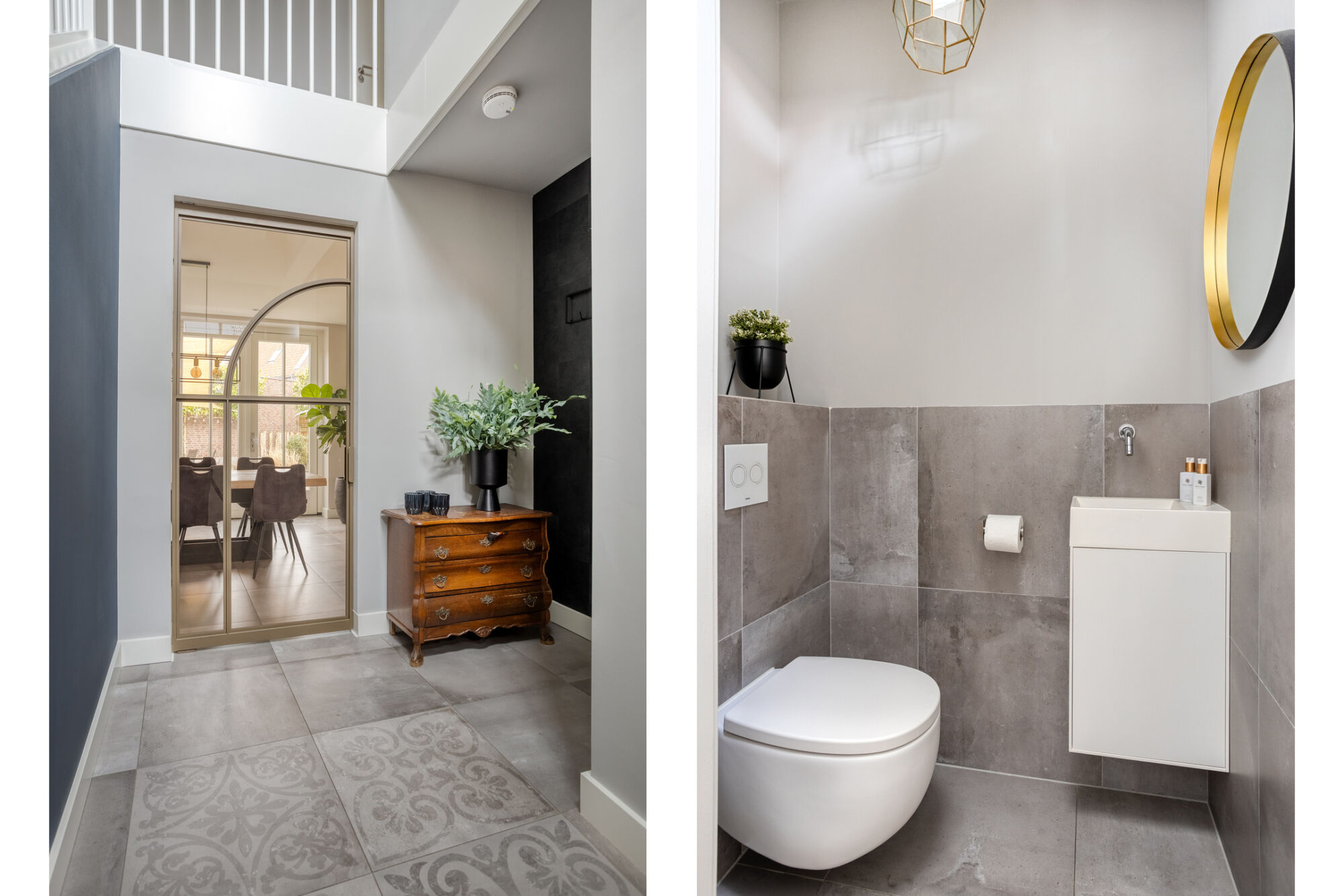 Voorentree met toegang tot de hal met vide. Direct bij binnenkomst ervaart u het zeer hoge afwerkingsniveau wat verder keurig wordt doorgetrokken in de rest van de woning. Strak stucwerk, hoge plinten, mooie deuren en een moderne tegelvloer (met vloerverwarming) zetten direct de toon voor wat betreft sfeer en luxe. In de hal bevindt zich verder een garderobenis en het luxe deels betegelde toilet met wandcloset en fonteintje.