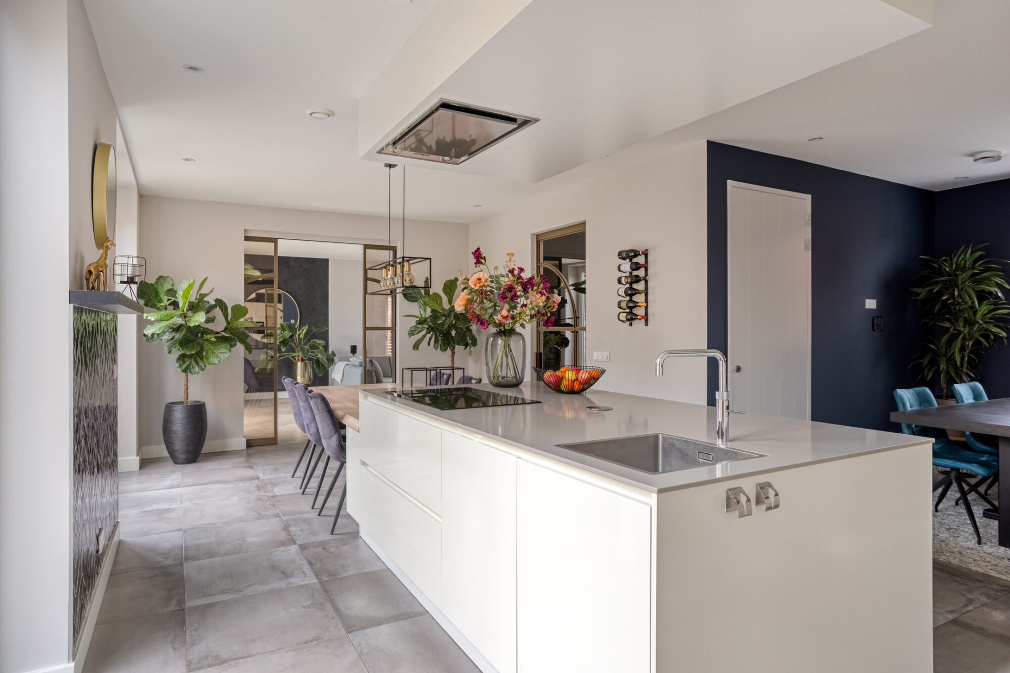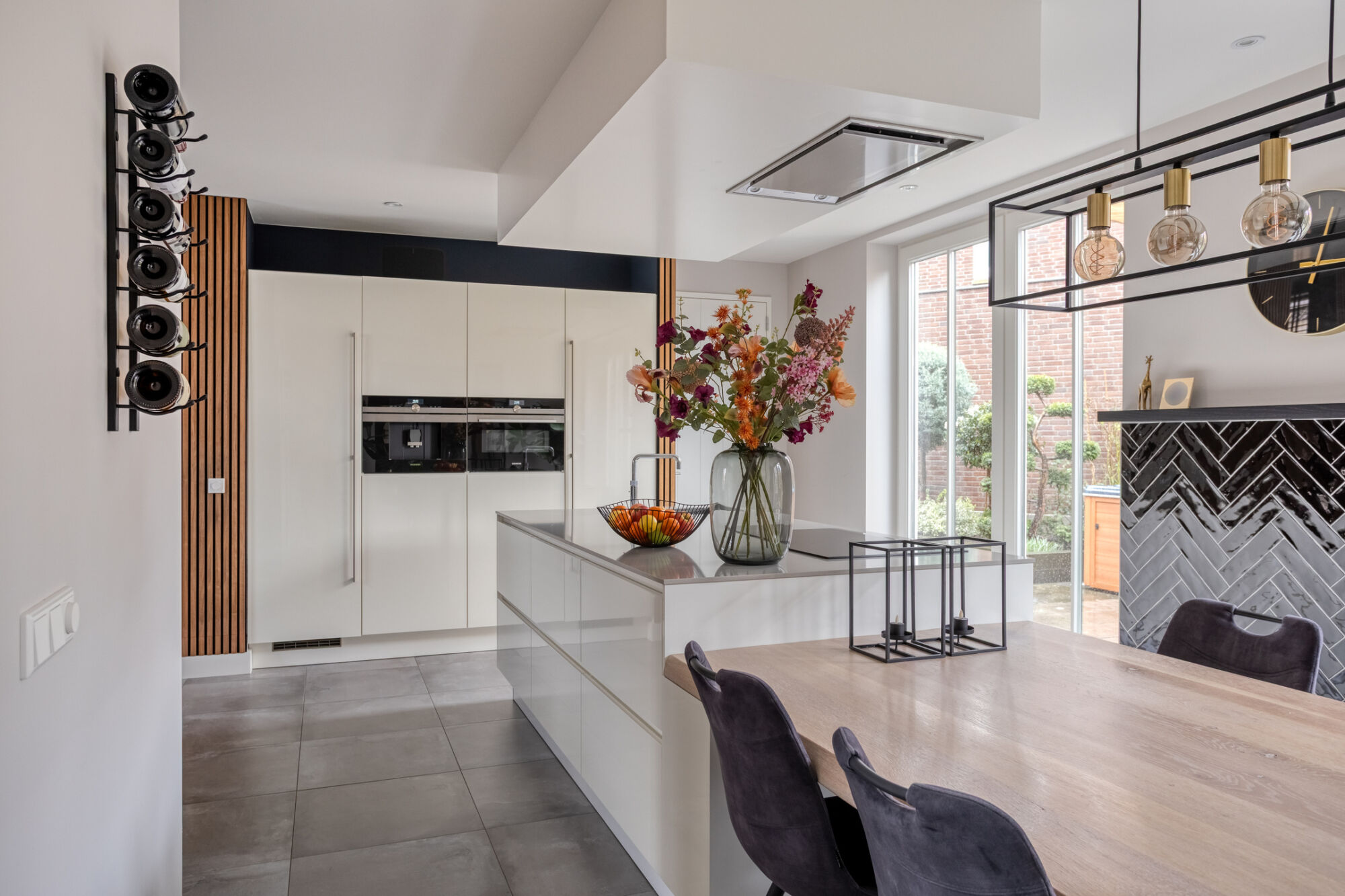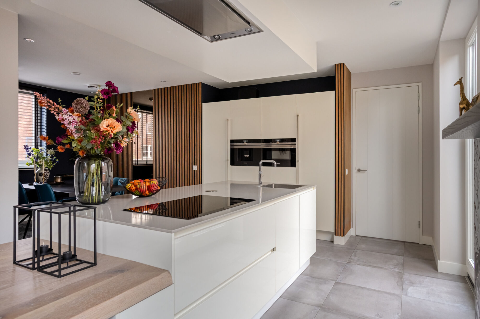 Via een fraaie stalen deur bereikt u de grote woonkeuken. De woonkeuken is het centrale hart van de woning en geeft u de mogelijkheid om heerlijk met familie en vrienden te vertoeven. De moderne en luxe inrichting van de keuken bestaat uit een kastenwand en een kookeiland. De keuken is voorzien van hoogwaardig Siemens keukenapparatuur zoals: Inductie kookplaat, Quooker, koffiezetapparaat, combi-oven, koelkast, vaatwasser en in het plafond geïntegreerde afzuigkap (met afstandsbediening).