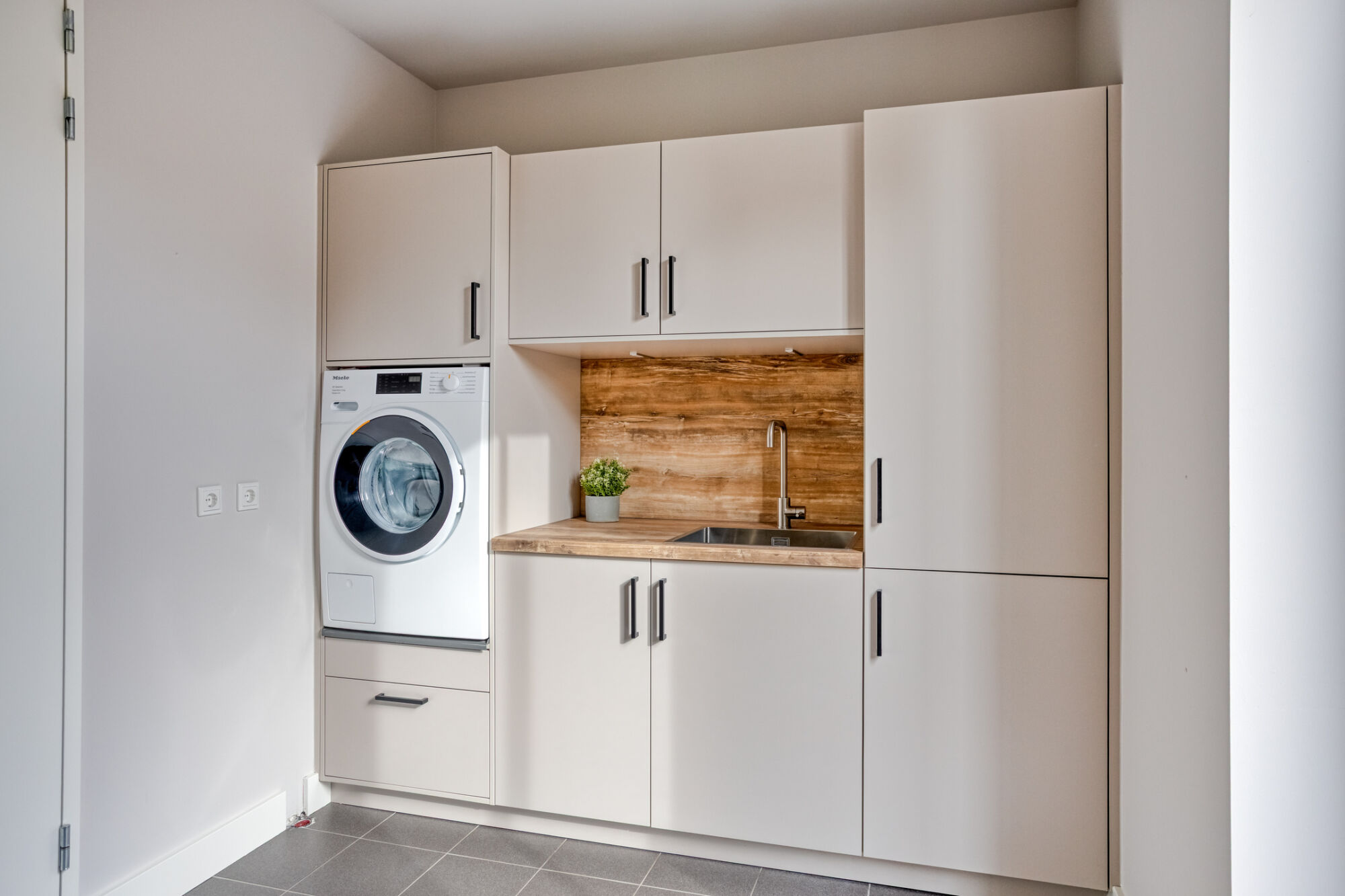 Er is meer dan voldoende kastruimte aanwezig en het stenen aanrechtblad heeft de keuken een duurzame en luxueuze uitstraling. Via de tuindeur heeft u toegang tot de tuin. Een praktische bergkast biedt u de mogelijkheid voor het opbergen van uw voorraad.