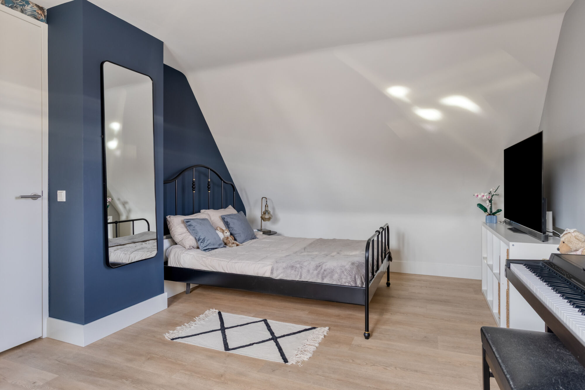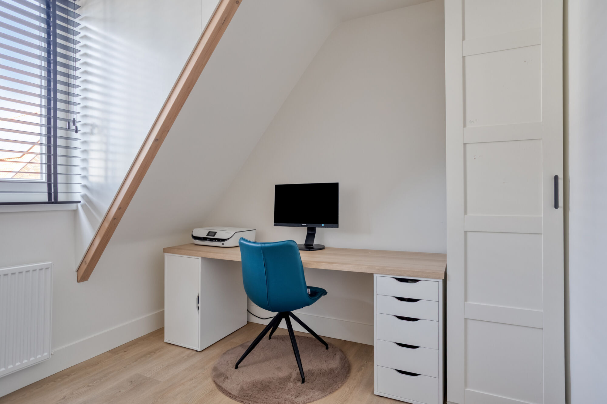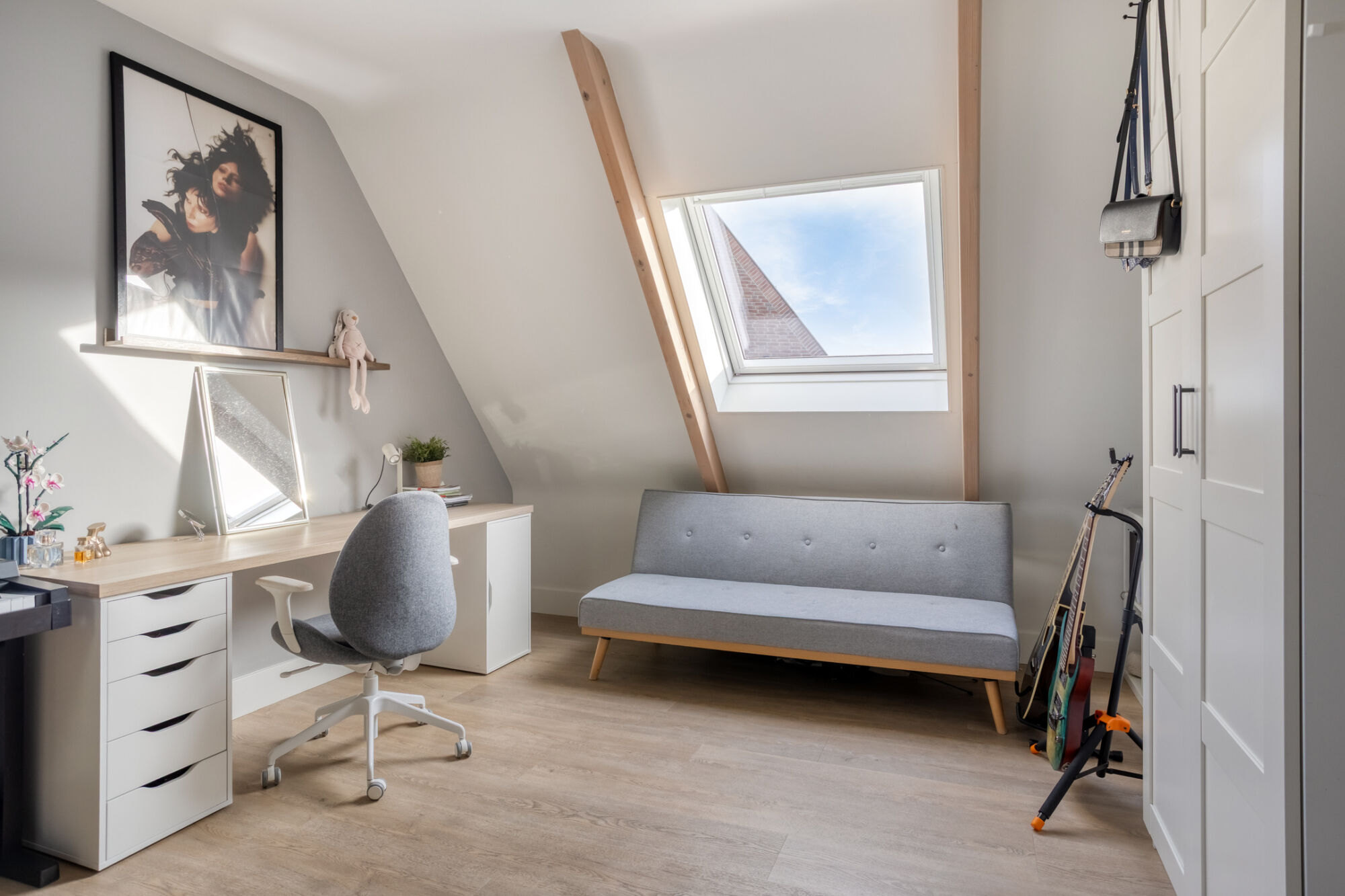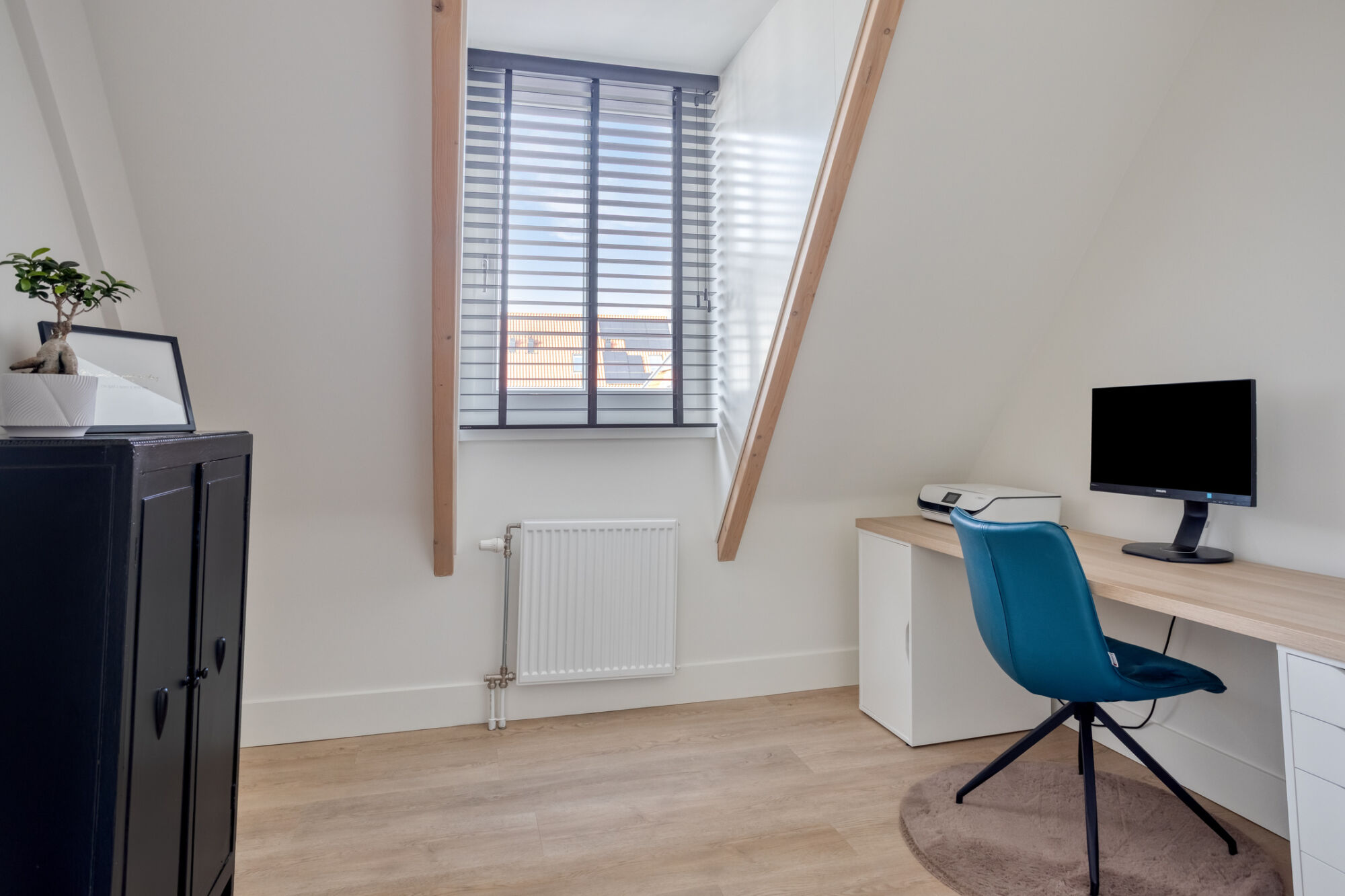 Uiteraard is ook op deze verdieping het afwerkingsniveau hoog: strakke stucwerk wanden, hoge plinten, een eiken PVC-vloer welke in 2024 recent is gelegd.