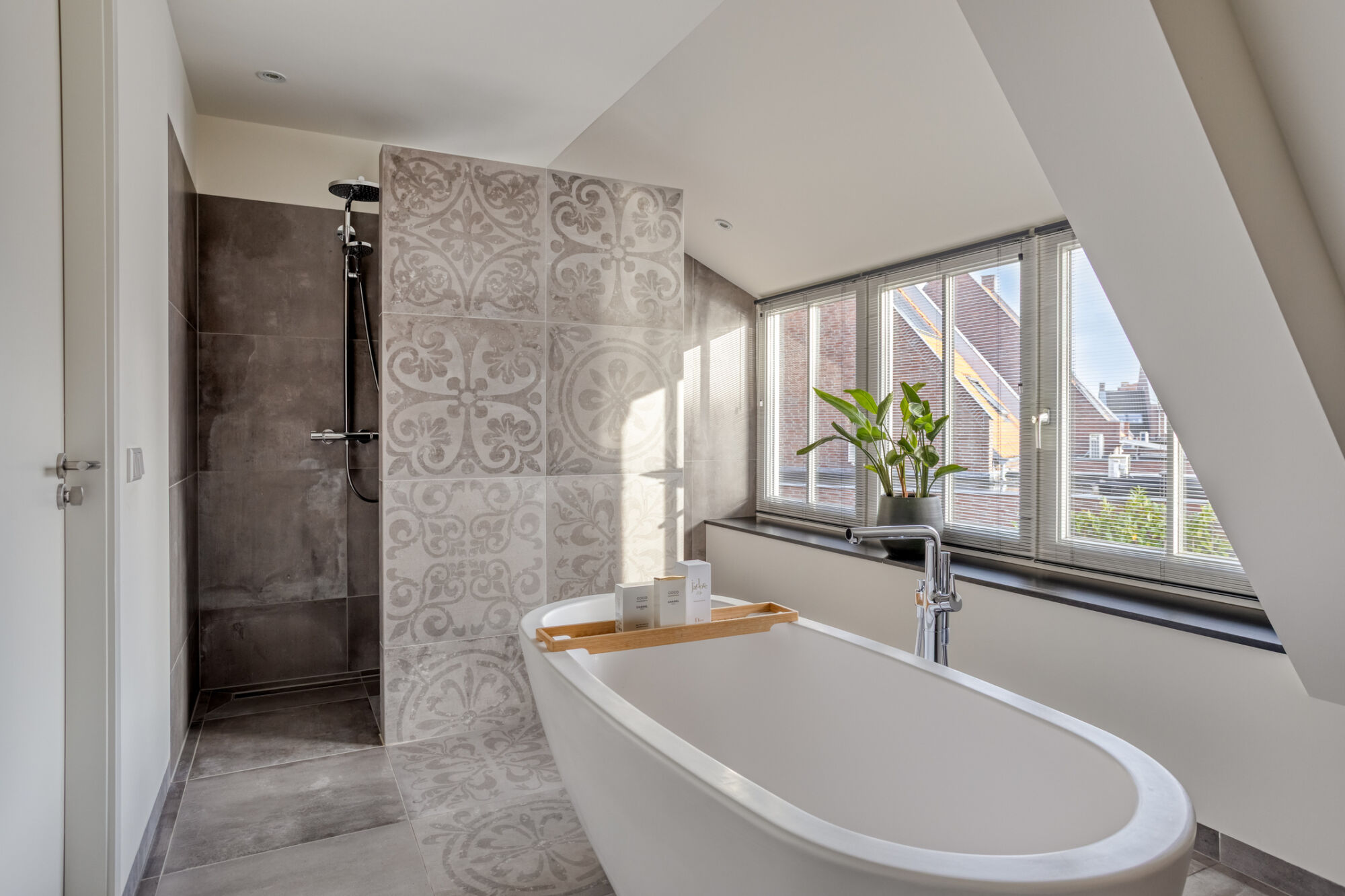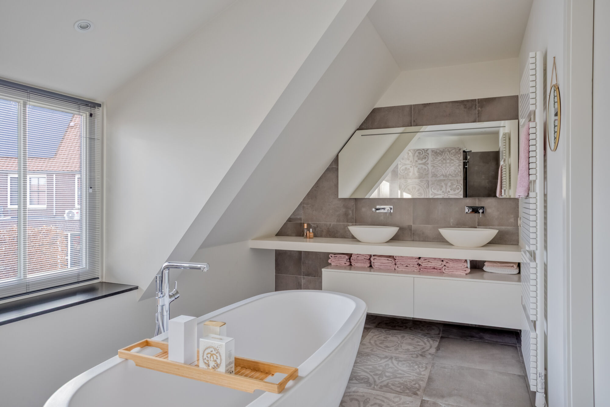Zeer fraaie betegelde badkamer met vrijstaand ligbad, inloopdouche, wandcloset en mooi zwevend badmeubel met dubbele wastafel en inbouwkranen. Een groot dakkapel zorgt in de badkamer voor extra daglicht en voor de mogelijkheid voor natuurlijk ventileren.
