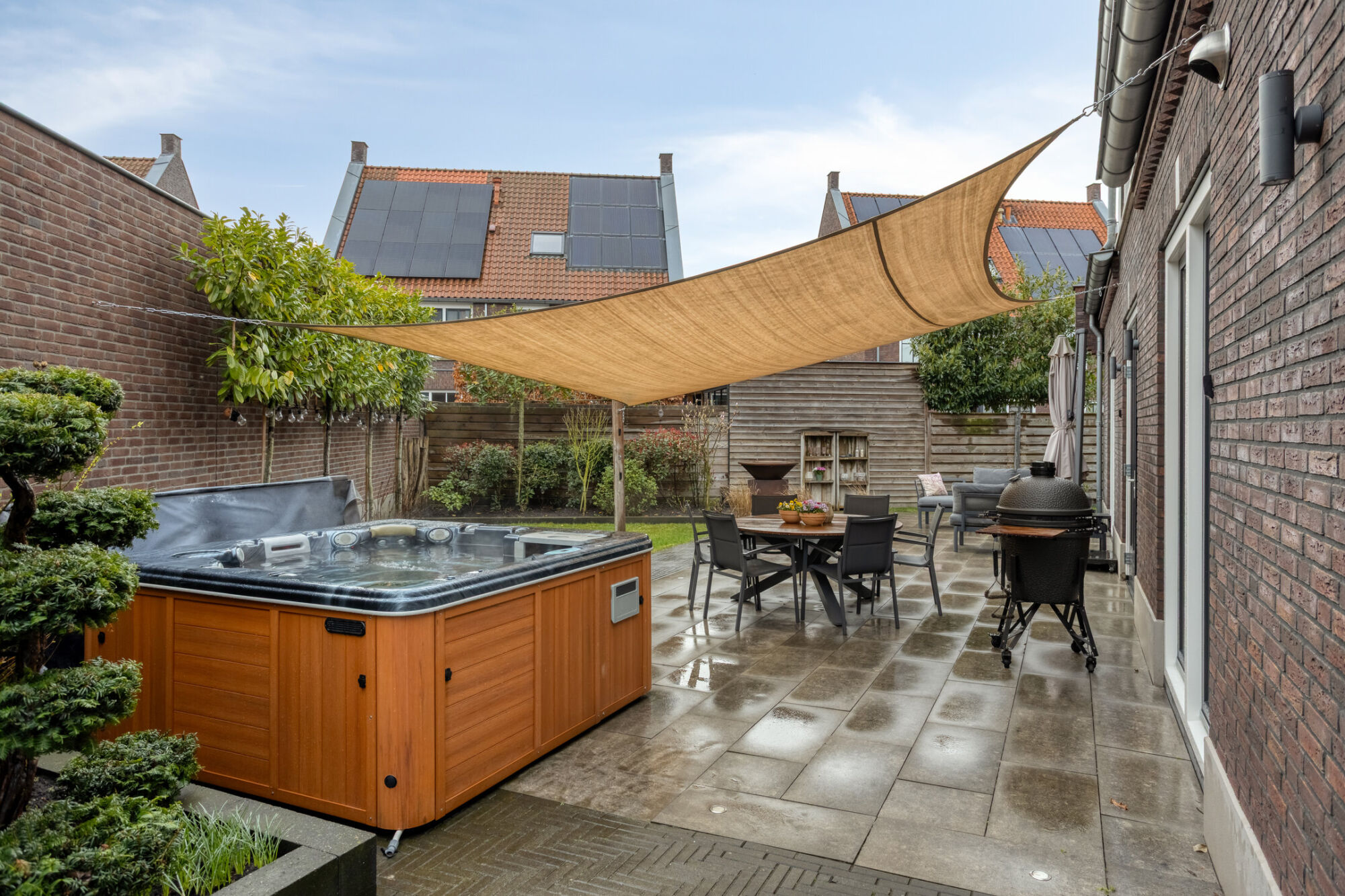De fraai aangelegde, rondom de woning gelegen achtertuin biedt een hoge mate van privacy en vormt een heerlijke plek om te ontspannen en van het buitenleven te genieten. De tuin is verzorgd aangelegd en beschikt over meerdere terrassen. Daarnaast is er een groen grasperk aanwezig, omlijst door een gevarieerde en volwassen vaste beplanting die zorgt voor een sfeervolle en natuurlijke uitstraling.