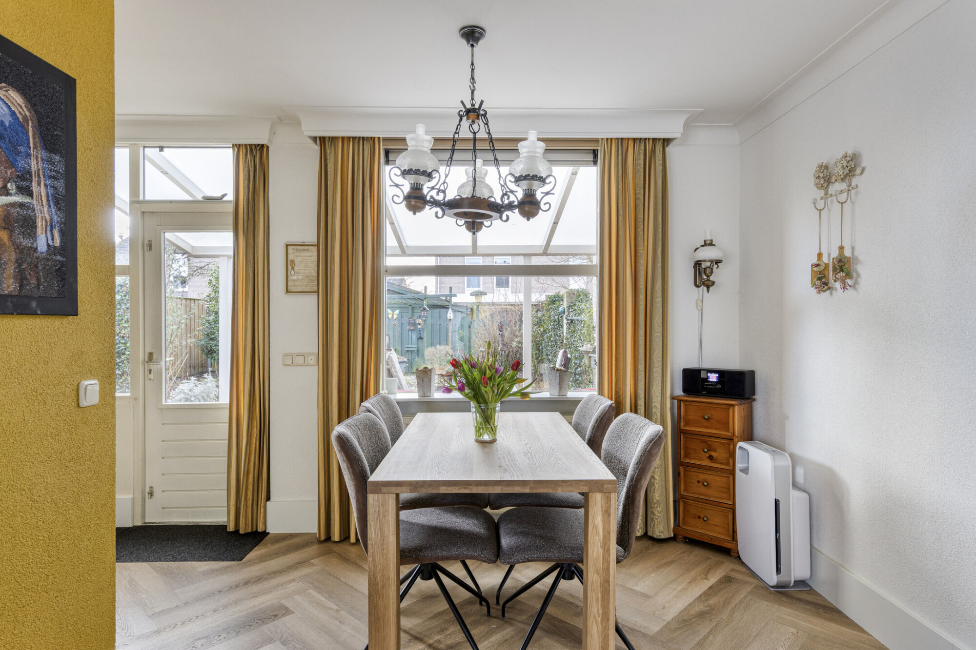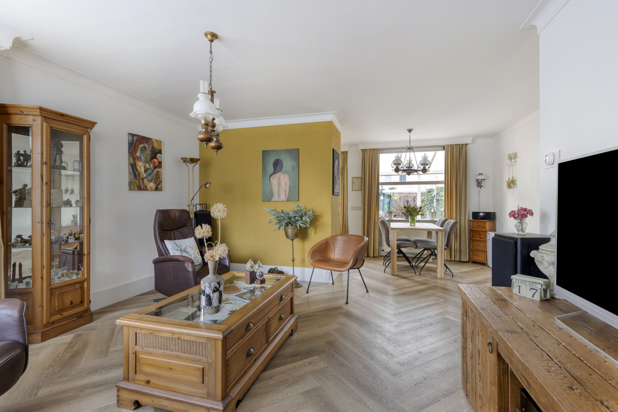 Ook in de woonkamer valt de hoogwaardige vloerafwerking direct op, fraai afgewerkt met prachtige hoge witte plinten die het geheel een stijlvolle uitstraling geven. De ruimte is praktisch en slim ingedeeld, met aan de ene zijde een prettige eetruimte en aan de andere zijde een comfortabele zitruimte. Deze indeling zorgt voor een prettige scheiding tussen de functies, terwijl het open karakter behouden blijft. Daarnaast beschikt de woonkamer over een handige vaste voorraadkast — ideaal voor het opbergen van huishoudelijke artikelen en extra provisie.