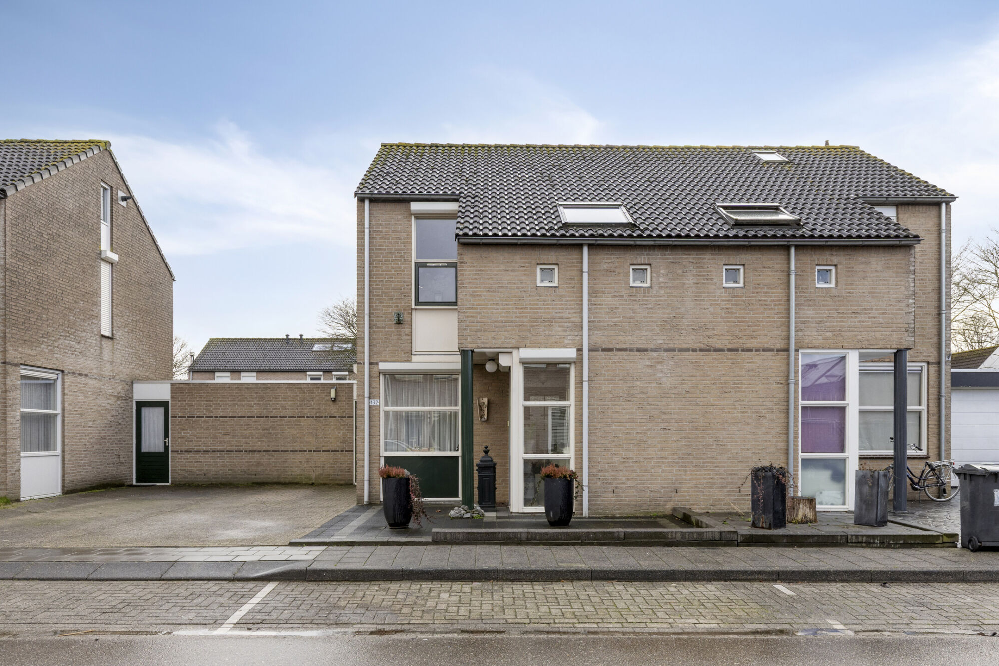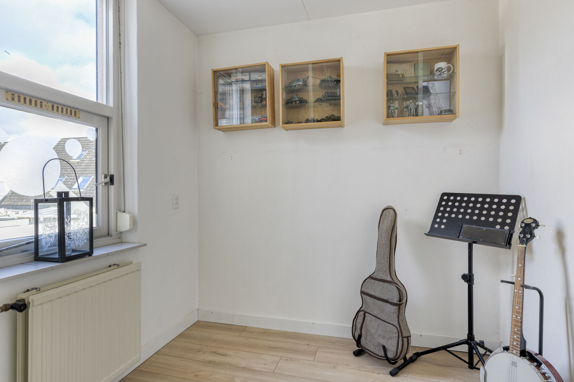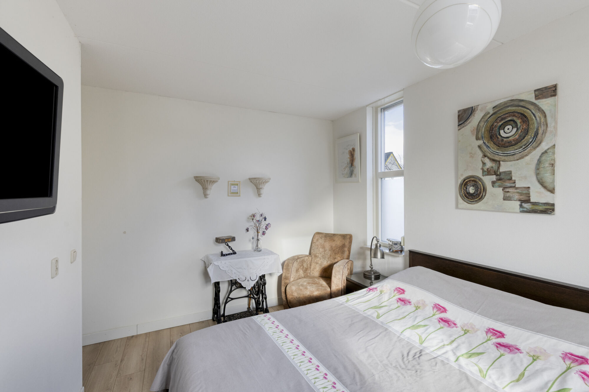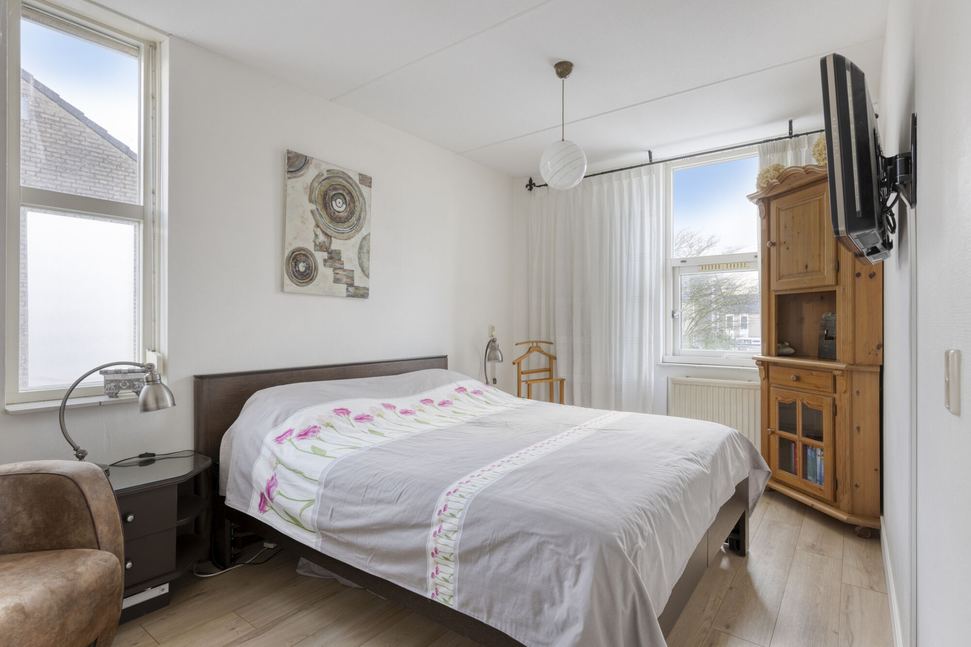 De woning beschikt over drie slaapkamers, waaronder de hoofdslaapkamer. Deze kamer is het ruimst van formaat en biedt moeiteloos plaats aan een tweepersoonsbed met nachtkastjes en aanvullende meubels. Dankzij de aanwezigheid van meerdere raampartijen aan verschillende zijden is de kamer bovendien heerlijk licht.