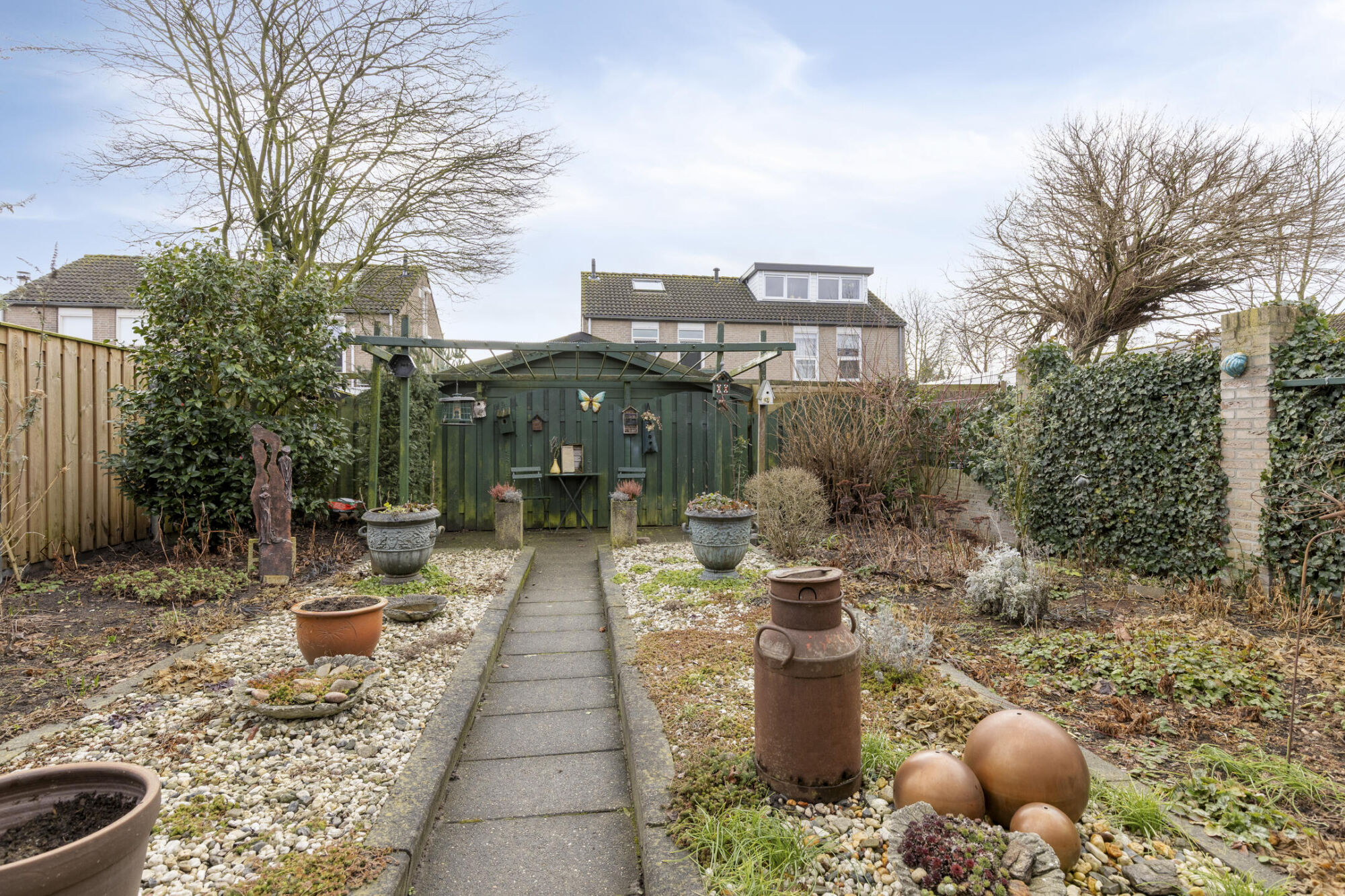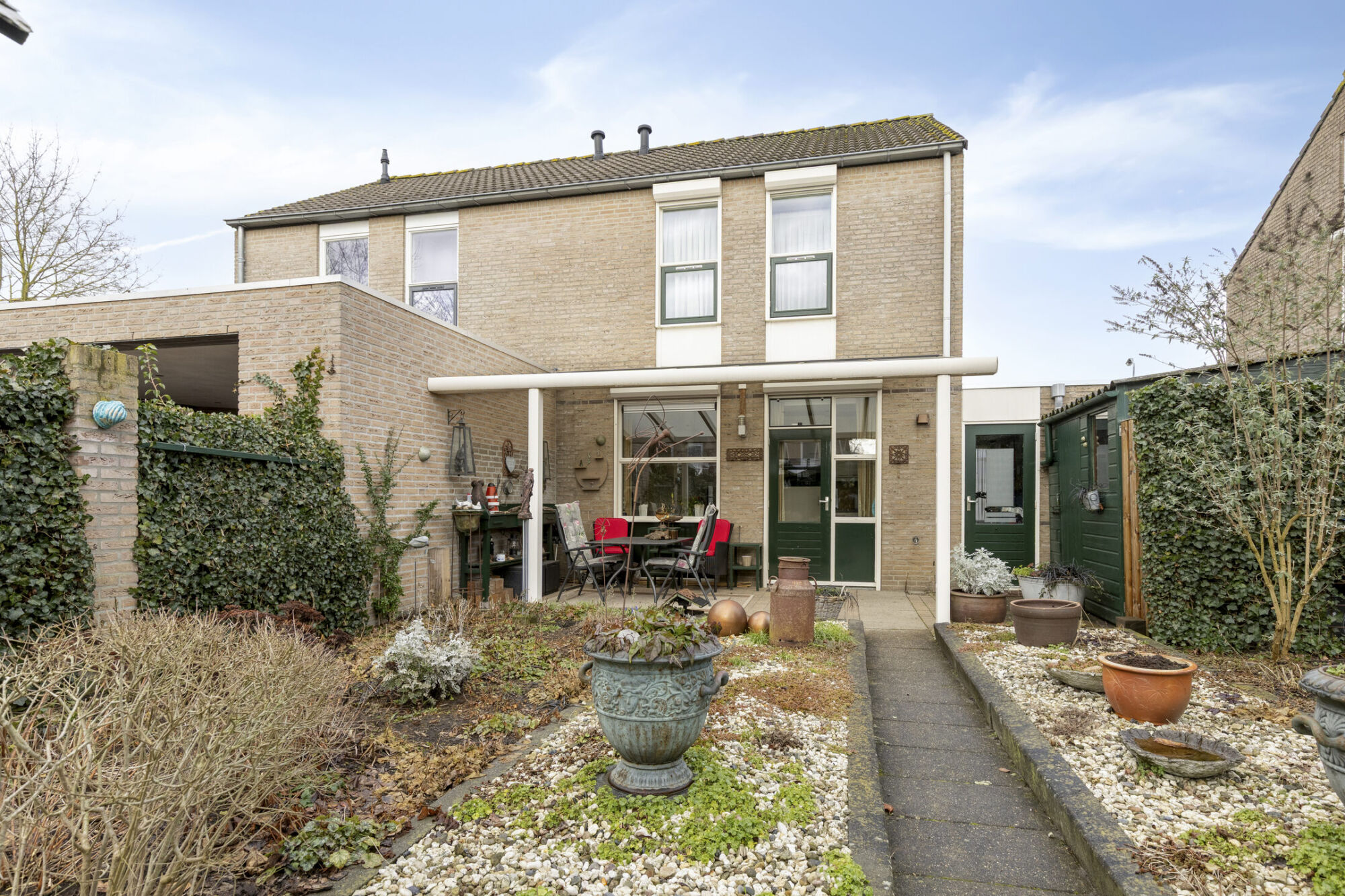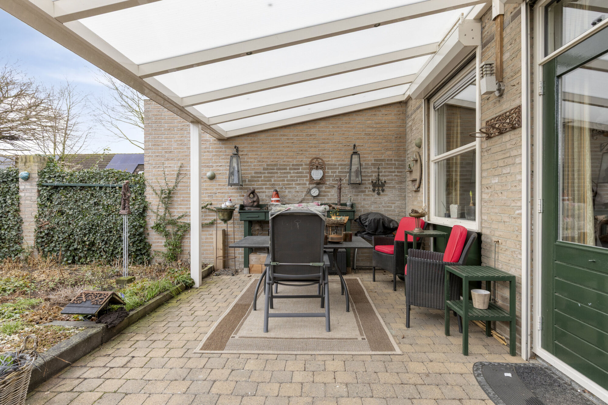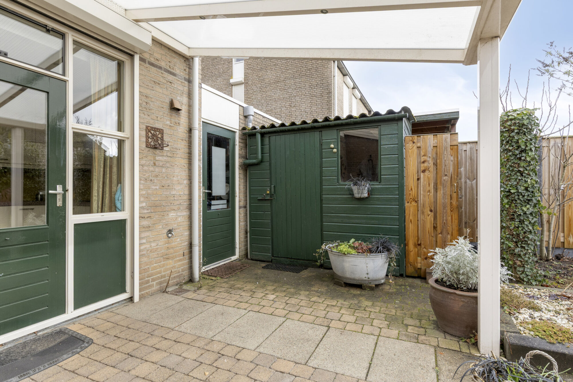 Direct tegen de woning bevindt zich een kunststof overkapping, waardoor je al vroeg in het seizoen comfortabel buiten kunt zitten. De sfeervolle verlichting maakt het geheel ook in de avonduren tot een fijne plek om te ontspannen. Aan de achterzijde van de tuin is er bovendien ruimte voor het creëren van een extra zitplek. Hier zou bijvoorbeeld eenvoudig een schaduwdoek gespannen kunnen worden, zodat je zelf kunt kiezen tussen zon en schaduw. Tot slot beschikt de tuin over een houten tuinhuisje, ideaal voor het opbergen van tuingereedschap en andere spullen.