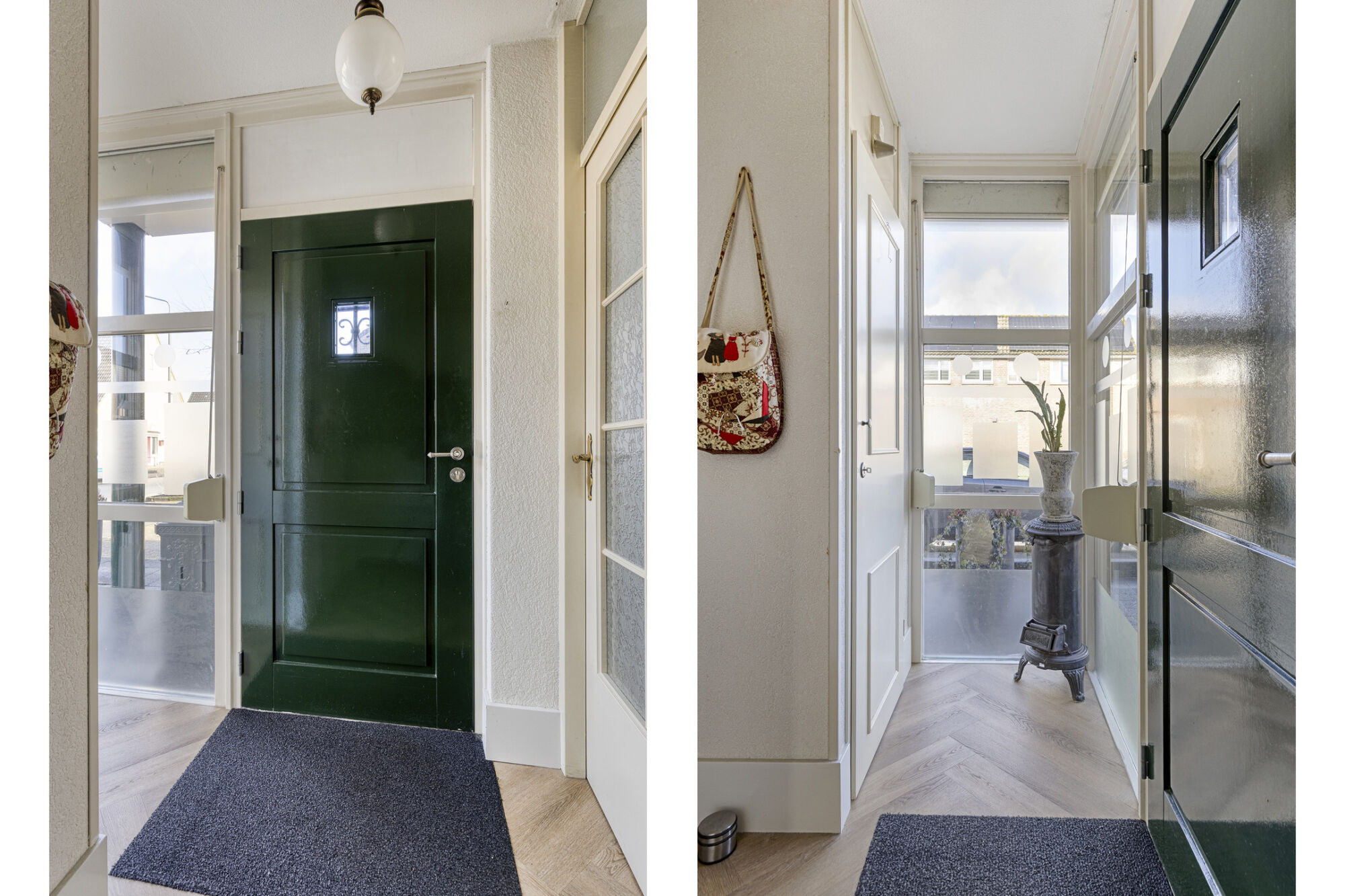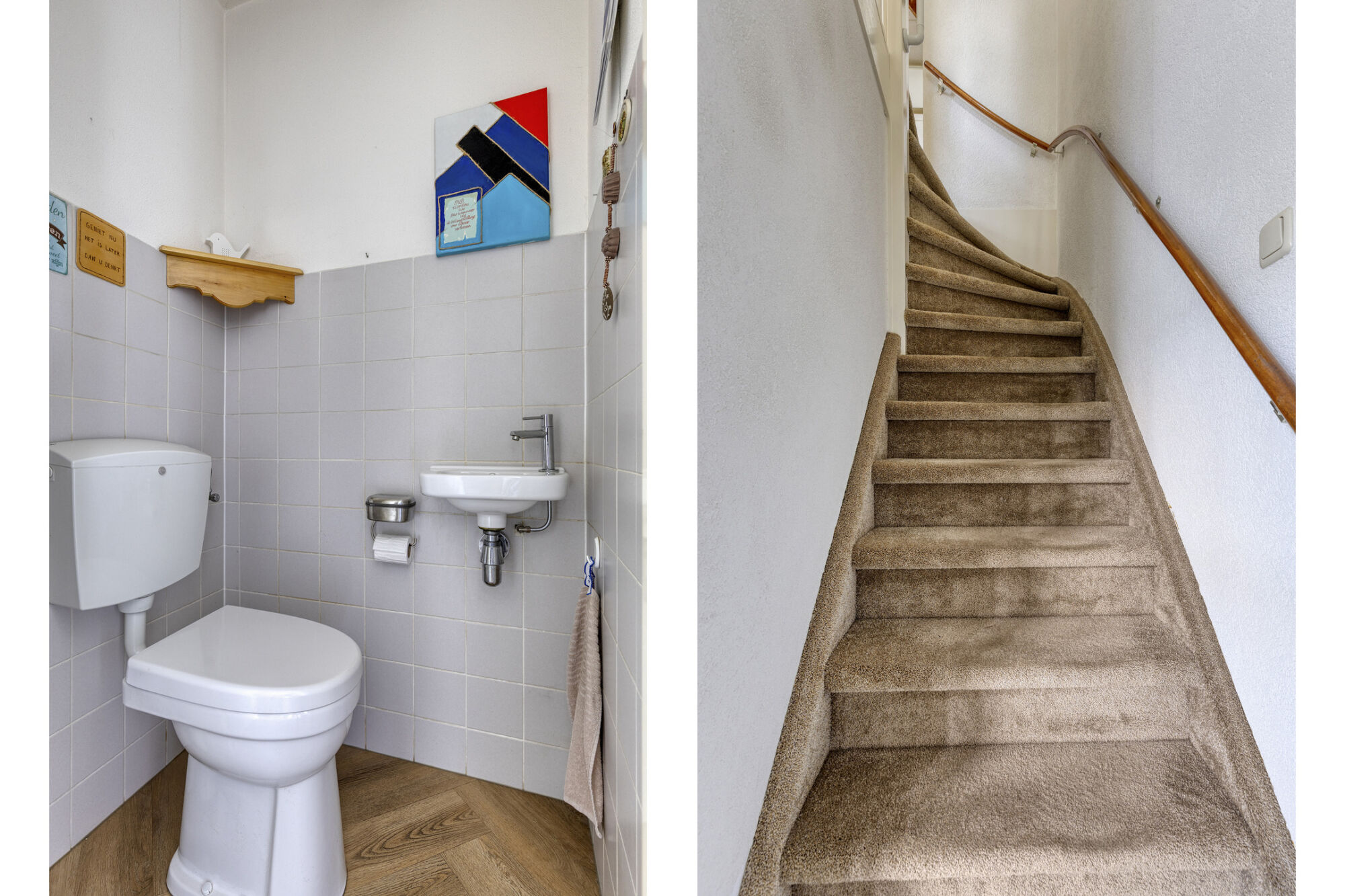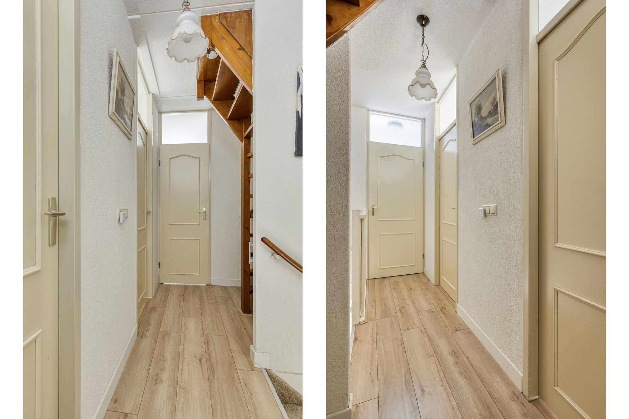 Bij binnenkomst word je direct verrast door de lichte en speels ingedeelde entreehal. De prachtige houtlook PVC-vloer in visgraatmotief springt meteen in het oog en geeft de hal een moderne uitstraling. Vanuit de hal heb je toegang tot het gastentoilet met fonteintje, de meterkast en de woonkamer.