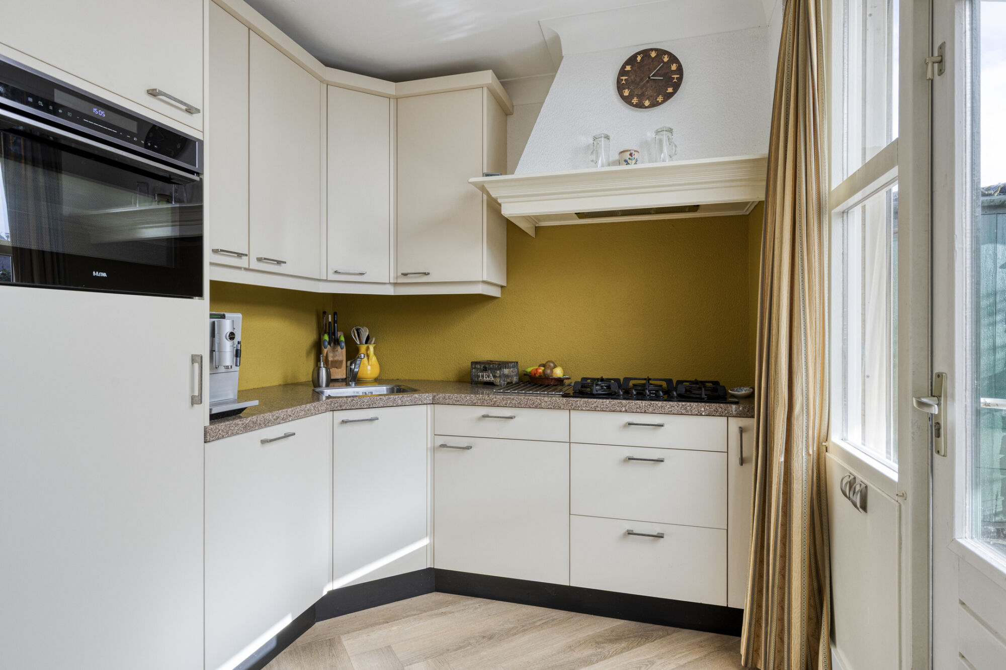 De keuken is aan de achterzijde van de woning gesitueerd, direct naast de eetkamer — een praktische en logische verbinding. De keuken is geplaatst in een hoekopstelling en is uitgevoerd met diverse inbouwapparatuur, waaronder een gaskookplaat, afzuigkap, vaatwasser, koelkast, combi-oven en een spoelbak. Het massieve keukenblad geeft het geheel een kwalitatieve uitstraling.