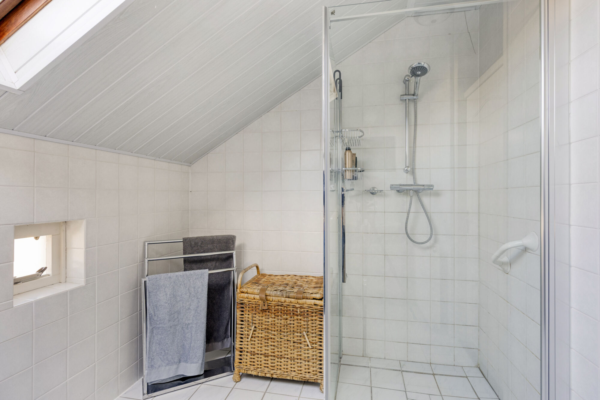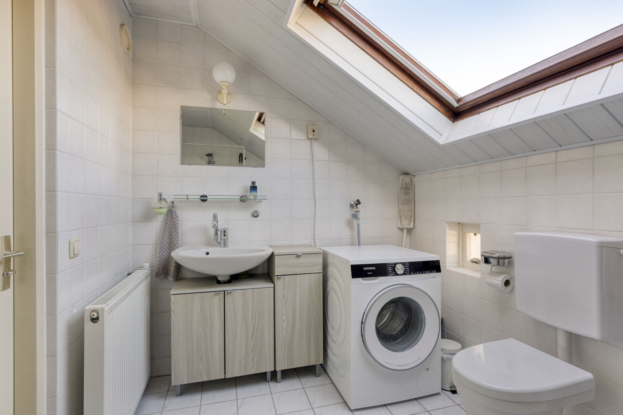 De badkamer is prettig licht dankzij het grote dakraam dat zorgt voor een natuurlijke lichtinval. De ruimte is volledig betegeld en voorzien van mechanische ventilatie. Op basis van sanitair is de badkamer uitgerust met een ruime