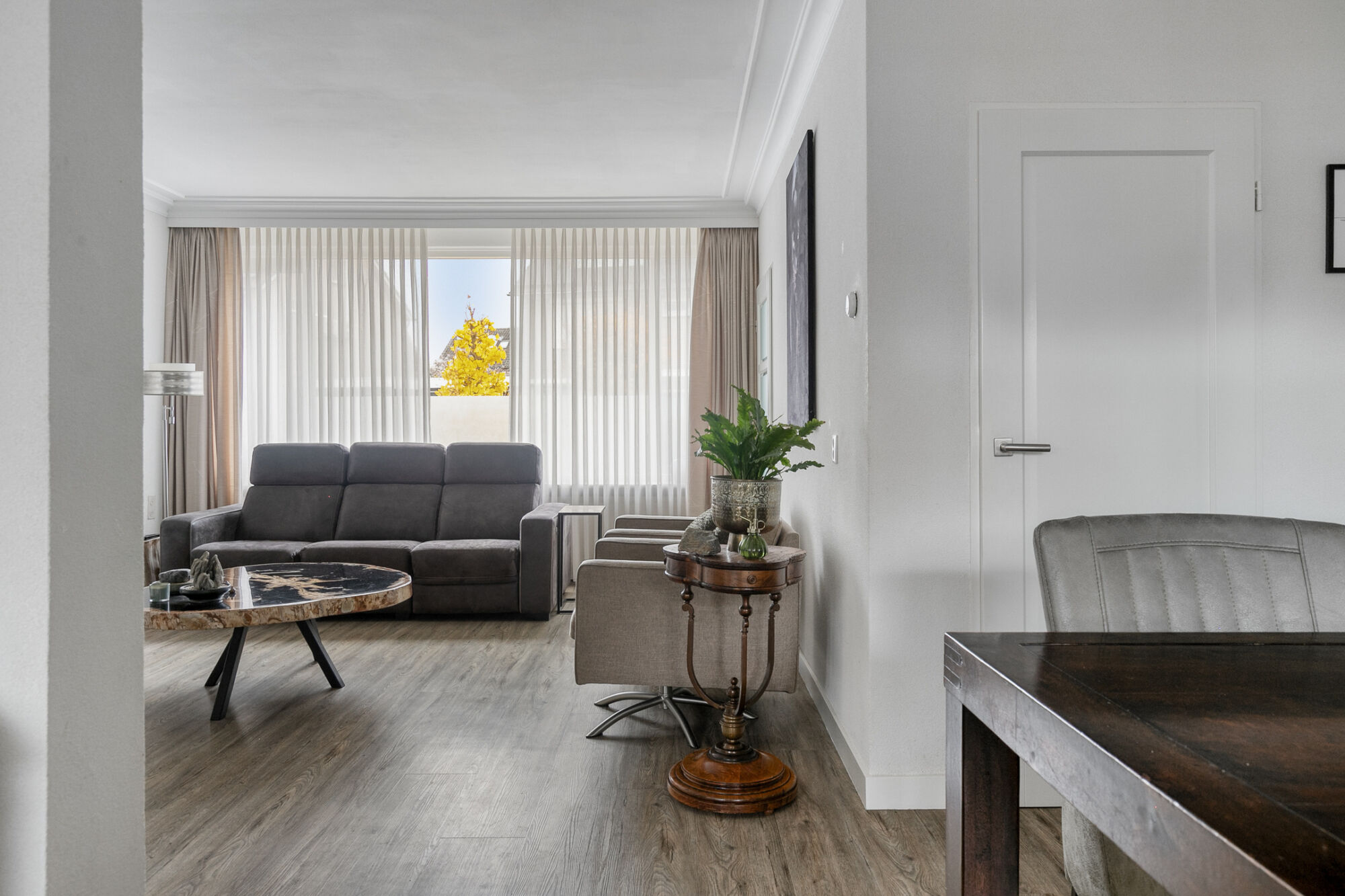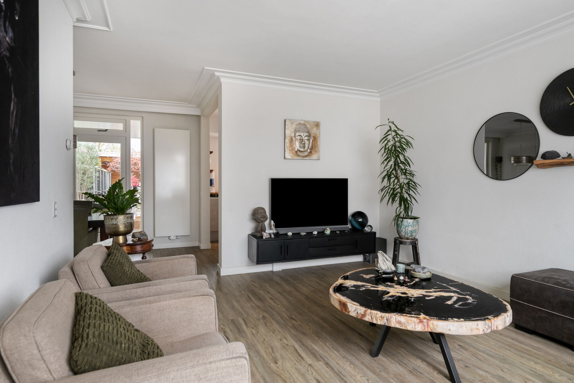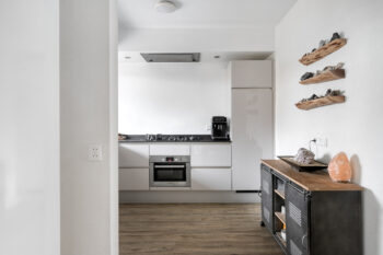 Vanuit de entree betreden we de zitruimte, gelegen aan de voorzijde van de woonkamer, met uitzicht over de rustige woonstraat waar zich voornamelijk bestemmingsverkeer bevindt. Deze zitruimte biedt diverse indelingsmogelijkheden vanwege de aanwezigheid van meerdere wanden om uw meubilair te plaatsen.