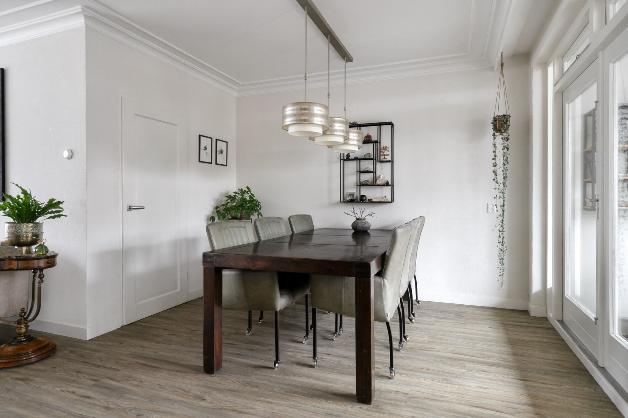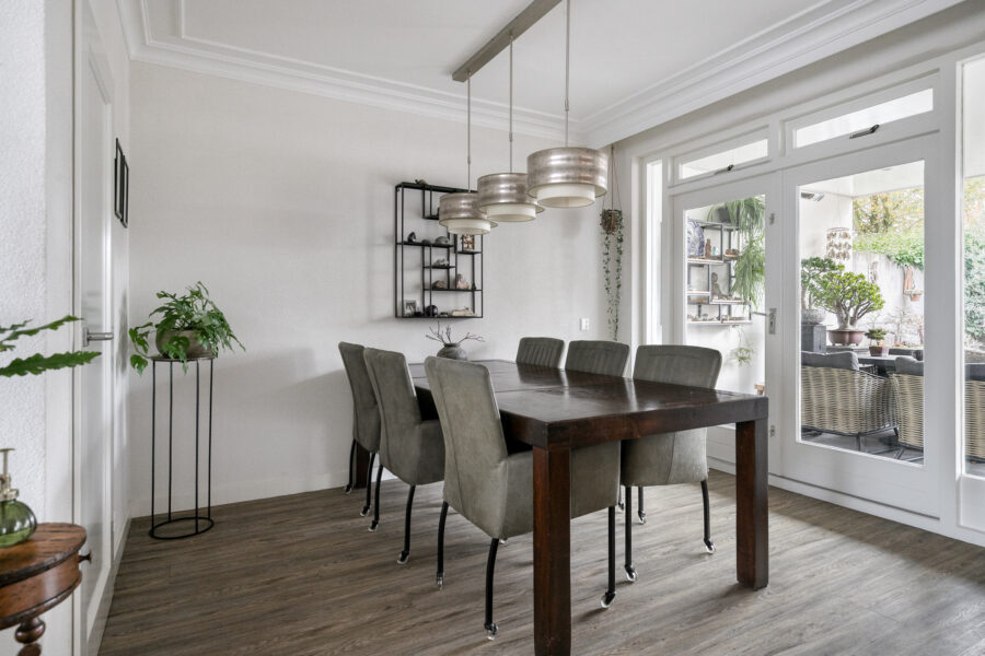 De woonkamer betreft een zogenaamde ‘’Z-kamer’’ en staat in open verbinding met de dinerruimte. Deze dinerruimte bevindt zich aan de achterzijde van de woning verzorgt via prachtige dubbele tuindeuren toegang tot het overdekt terras van de achtertuin. De deur in de dinerruimte verzorgt toegang tot de trapkast en de woonkamer staat in open verbinding met de keuken aan de rechterzijde van deze woning. De gehele begane grond is voorzien van een strakke pvc-vloer, uitstekend stucwerk en voorzien van een fraaie lijst rondom in het plafond!