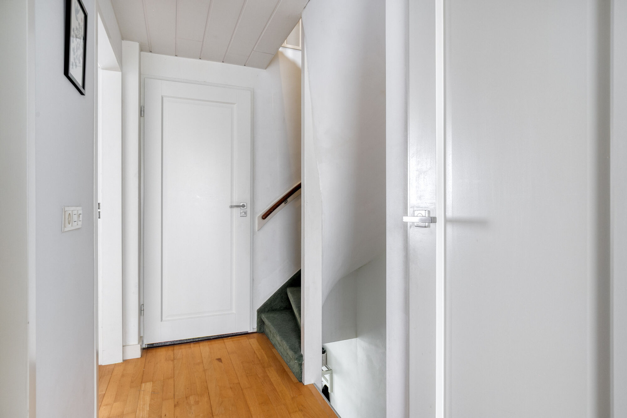 Via de vaste trap op de eerste verdieping krijgen we toegang tot de overloop van de tweede verdieping. Op deze overloop bevinden zich de was- en technische ruimte, evenals de toegang tot de vierde slaapkamer.