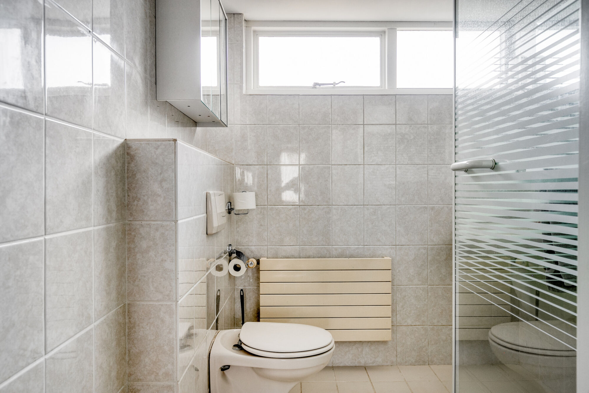 Aan de voorzijde van deze eerste verdieping bevindt zich de badkamer, geheel voorzien van strak tegelwerk en een raam ten behoeve van ventilatie en toetreding van natuurlijk daglicht. De badkamer is verder voorzien van een wandcloset, inloopdouche en een wastafelmeubel met planchet.