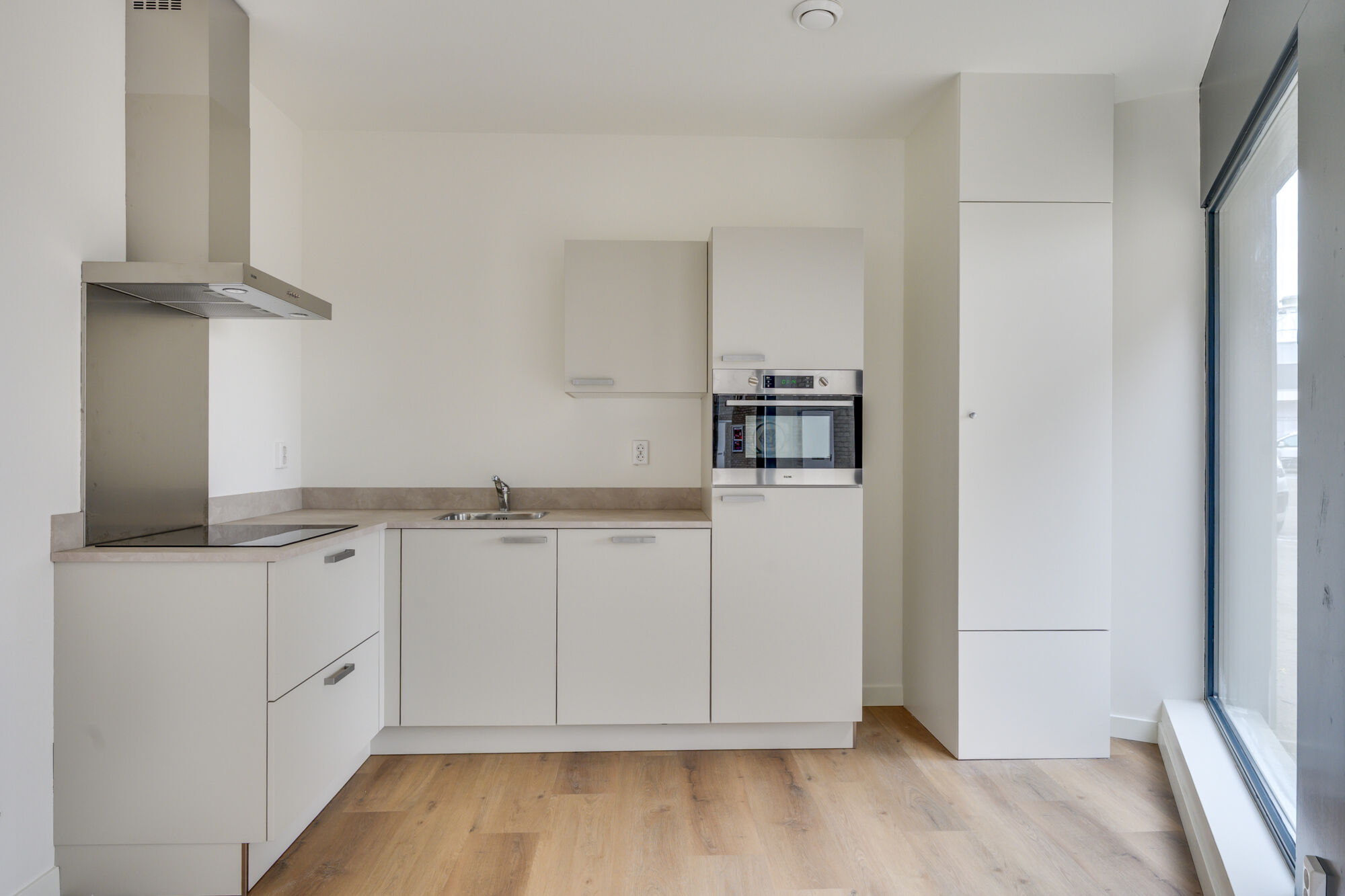 De entreehal beschikt over ruimte voor een garderobe en een extra kastruimte voor berging. Vervolgens stapt u de lichte en speelse leefruimte binnen. Dankzij de bijzonder grote raampartijen aan de voorzijde en zijkant geniet het appartement veel daglicht. Deze woning is geheel gemoderniseerd, voorzien van strakke wand- en plafondafwerking in de vorm van stucwerk, een hoogwaardige pvc-vloer met strakke plinten en een ruim aantal elektrapunten.