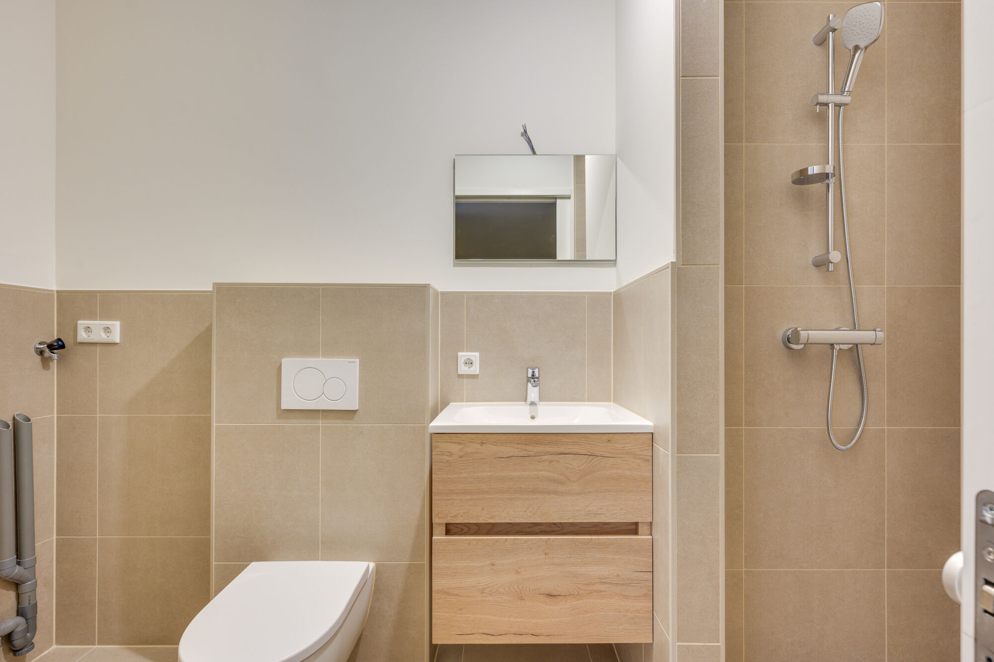Aan de achterzijde van de studio is de badkamer gesitueerd. Een zeer efficient ingerichte badkamer, voorzien van grote en chique tegels, daarbij een moderne afwerking en hoogwaardig sanitair. De badkamer beschikt over een inloopdouche, wastafel met meubel, wandcloset, centrale afzuiging en de witgoedaansluiting.