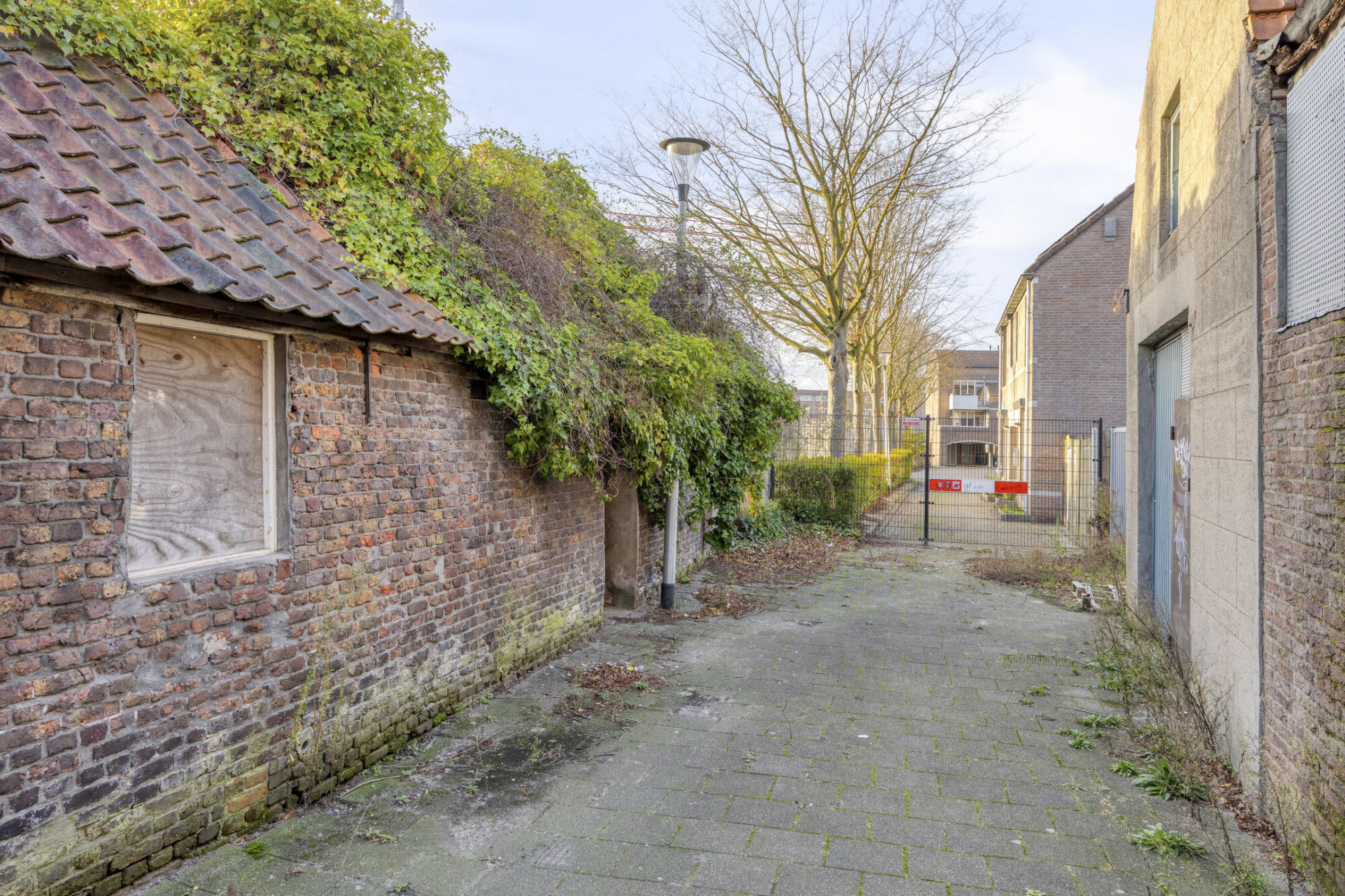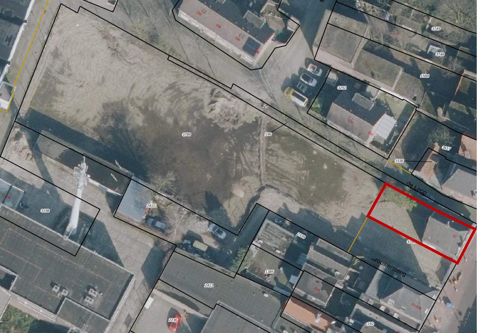 Oppervlakte: ca. 200m². Verkoper draagt zorg voor splitsing van het perceel vóór datum transport, conform de indicatieve tekening met rode arcering bij de foto’s.