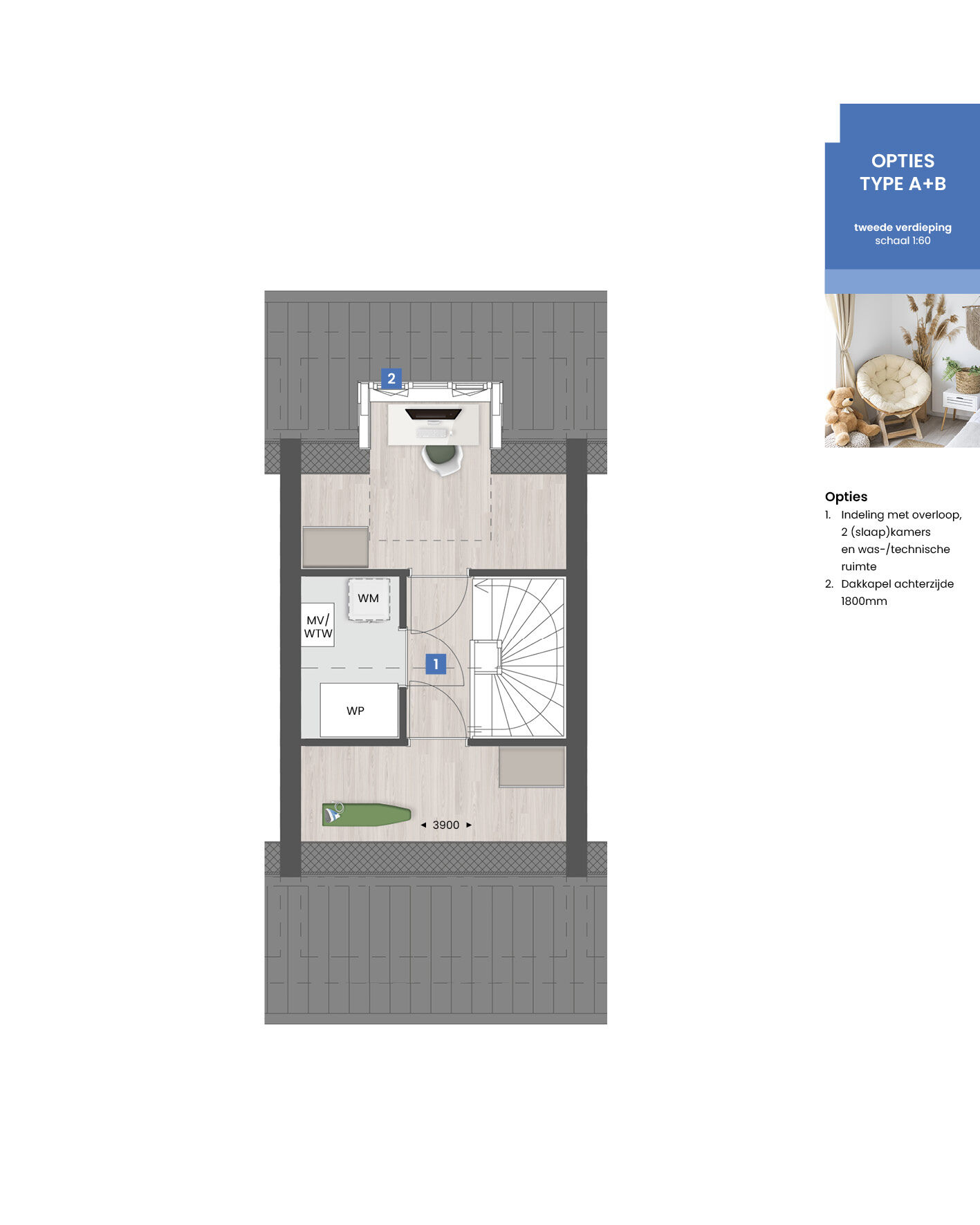 Maak van deze nieuwe woning écht jouw thuis met de beschikbare opties. Met bijvoorbeeld een aanbouw van 1,20 meter en openslaande tuindeuren maak je de woonkamer nóg groter en lichter. Van de tweede verdieping kun je een volwaardige woonverdieping maken door diverse opties. Met de keuze voor een vaste trap, eventueel dakkapellen aan de voor- en achterzijde én de indelingsoptie, creëer je hier twee kamers én een wasruimte.