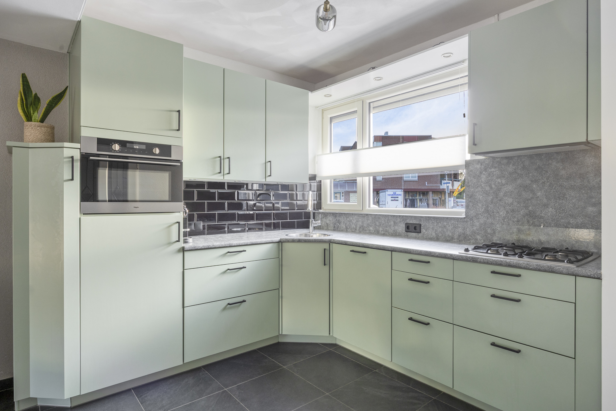 In hoekopstelling tegen de wanden geplaatst en met uitzicht over het parkeerhofje middels een fraai raamkozijn (voorzien van elektrische screen) bevindt zich de keuken. Deze keuken is zeer praktisch ingericht vanwege de aanwezige berg- en werkruimte. Aan inbouwapparatuur treffen we: